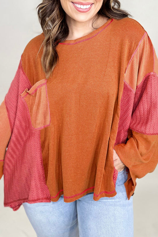 Bonbon Spiral Ribbed Exposed Seam Detail Plus Size Long Sleeve Top