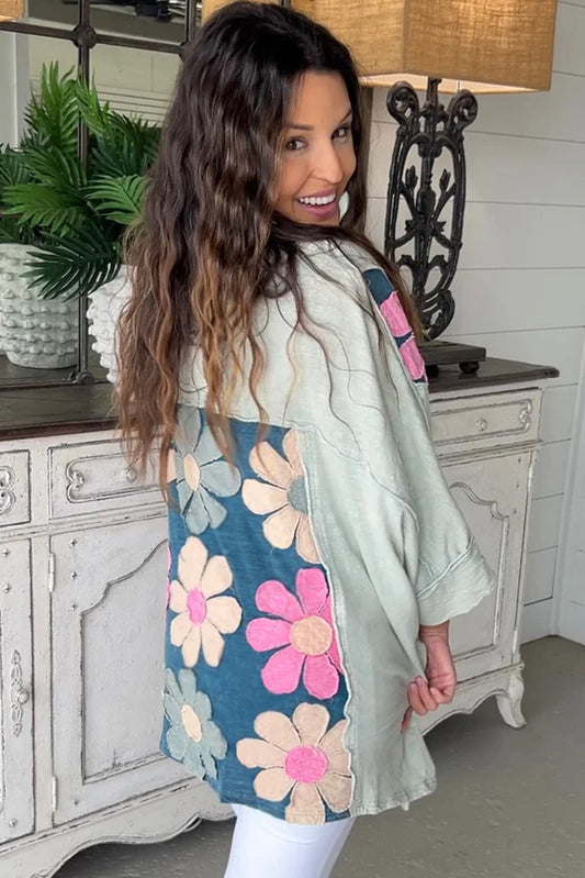 Grass Green Flower Applique Mineral Wash Plus Size Top