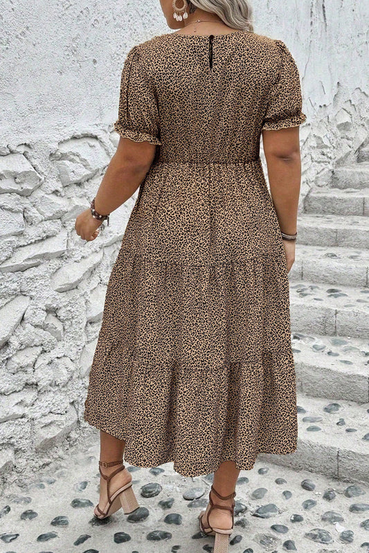 Beige Plus Size Leopard Print Frill Trim Short Sleeve Flared Dress