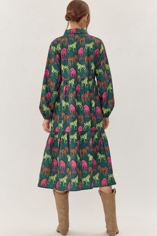 Green Horse Printed Long Sleeve Collared Buttoned Plus Size Midi Dress
