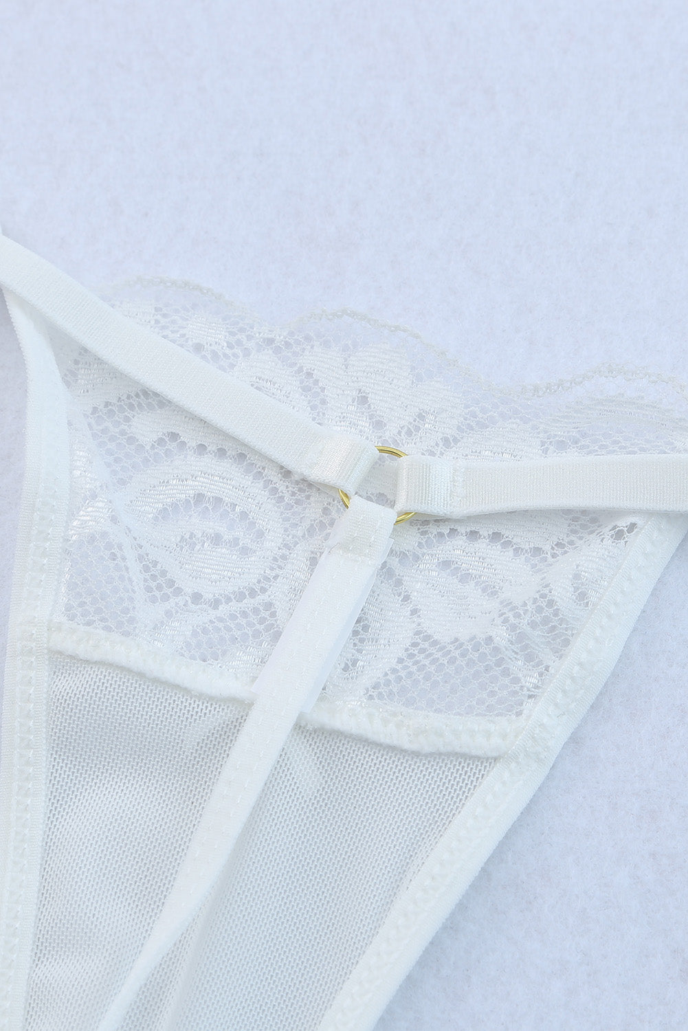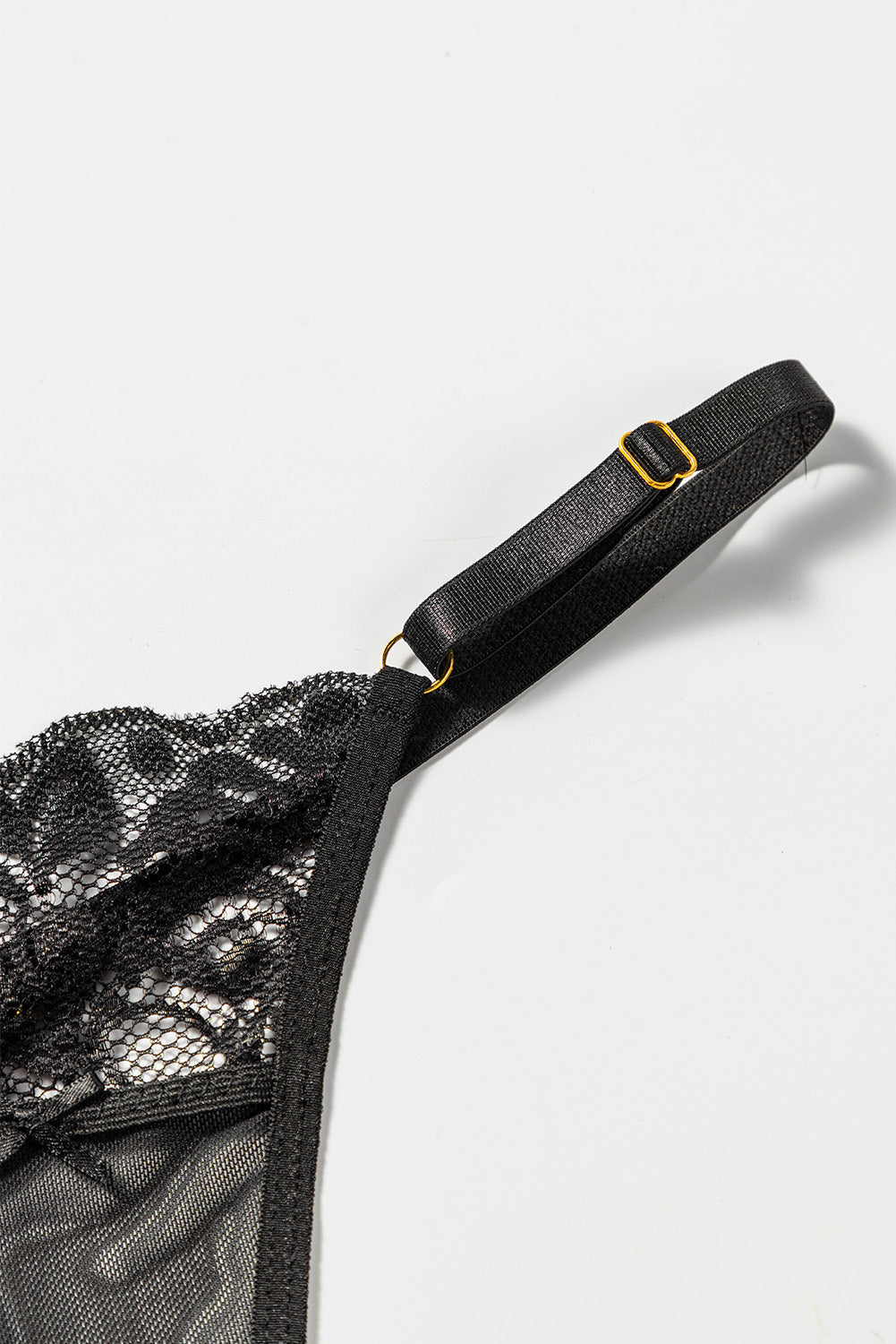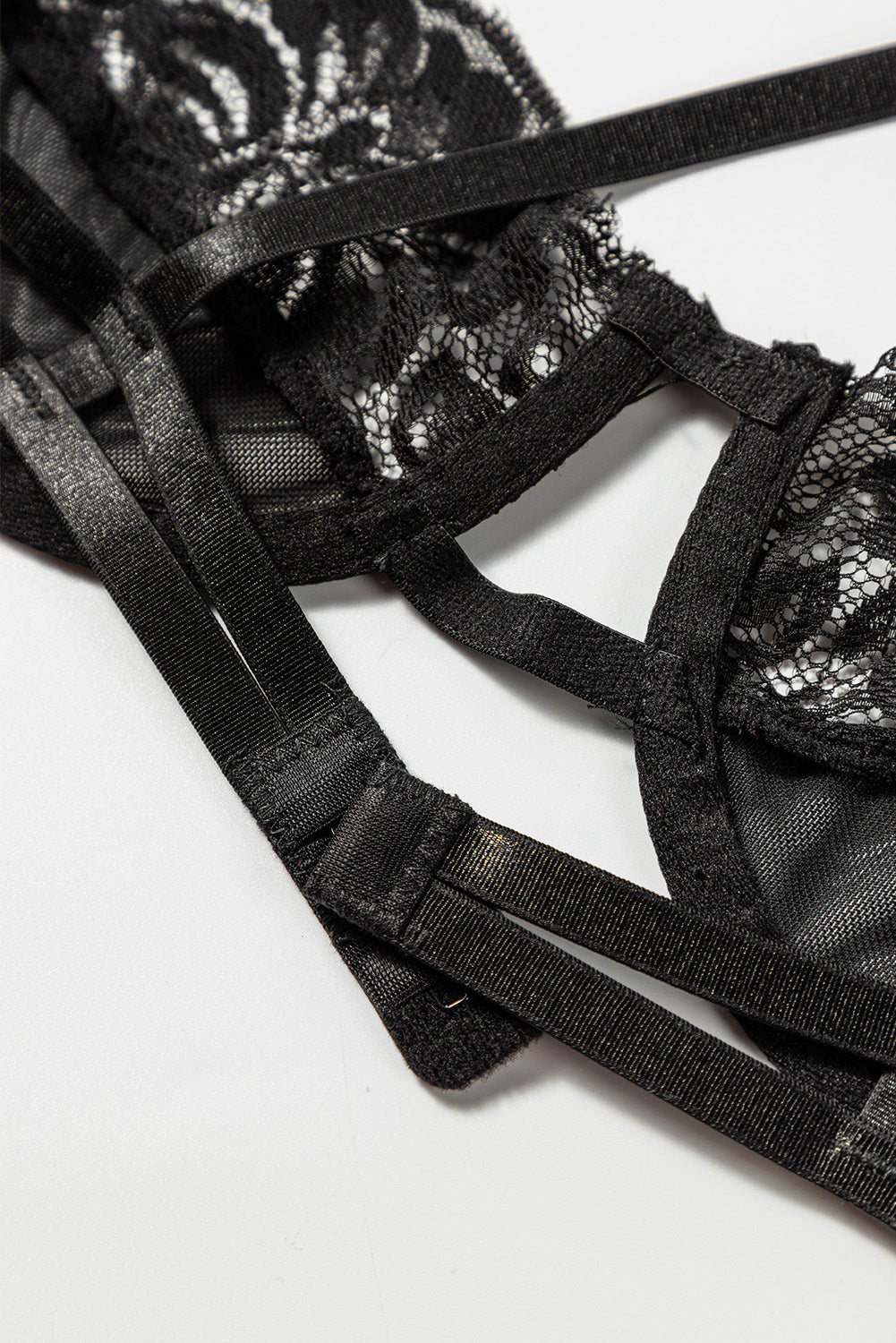 - Esta lencería sexy incluye sujetador de encaje, tanga y liguero.