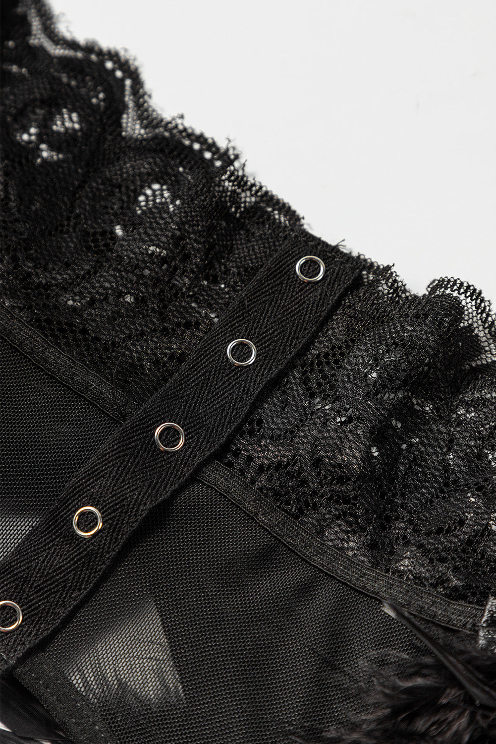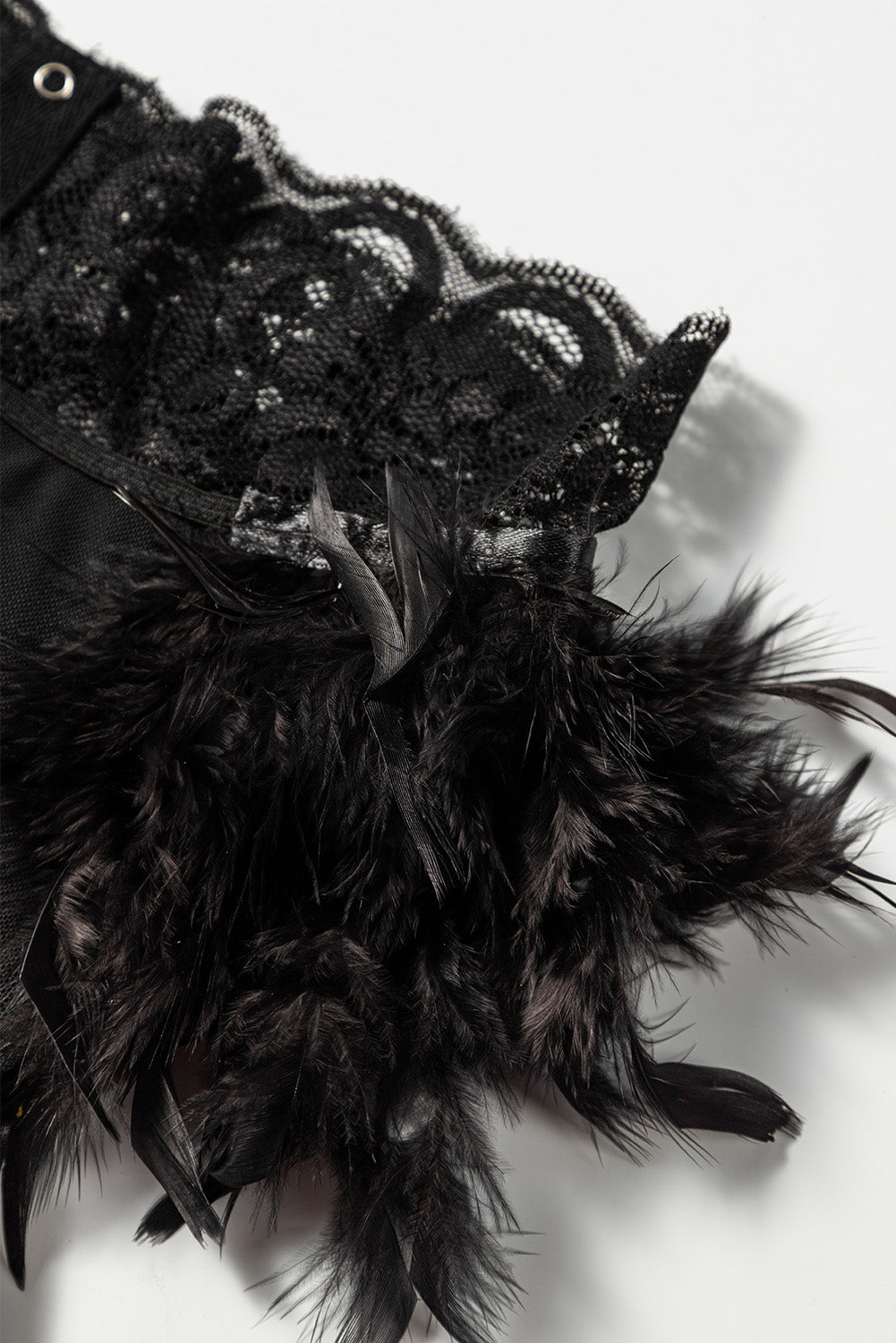 - Las plumas y el encaje hacen que el conjunto sea delicado y llamativo.