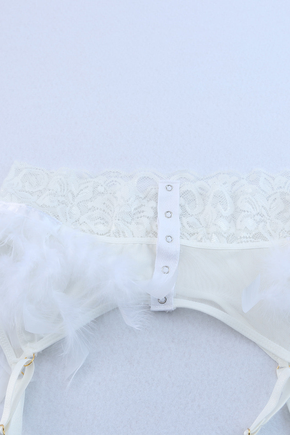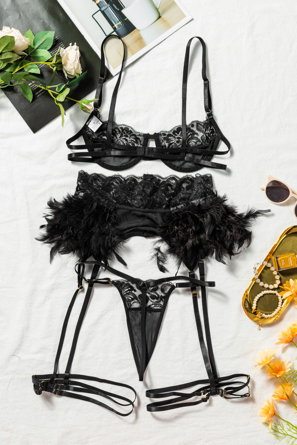 3 piezas set de lencería de malla de encaje con liguero de plumas