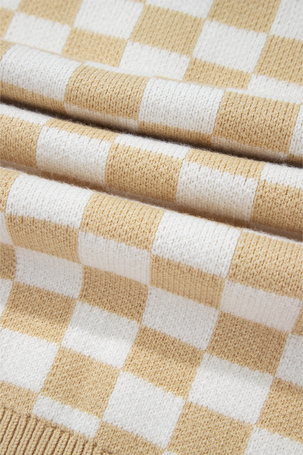 Apricot Checkered Buttons Collar V Neck Drop Shoulder Sweater