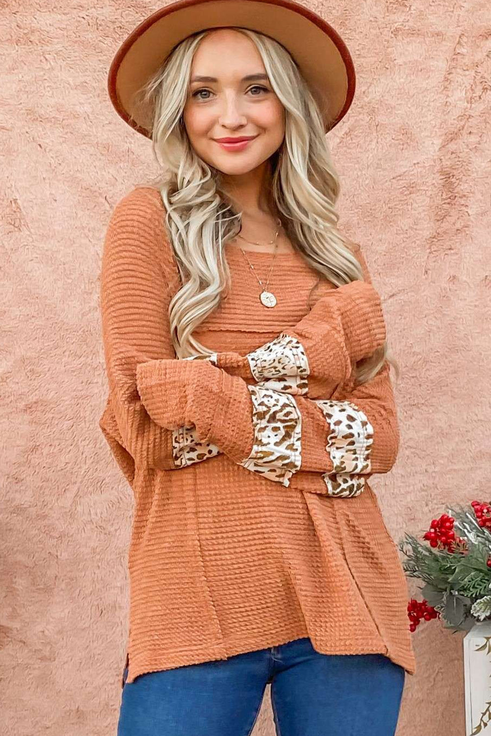 Top de punto tipo gofre con costuras expuestas y empalme de leopardo albaricoque