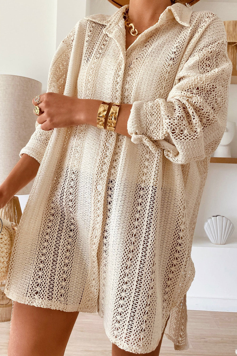 Beige Lace Crochet Collared Tunic Oversized Shirt