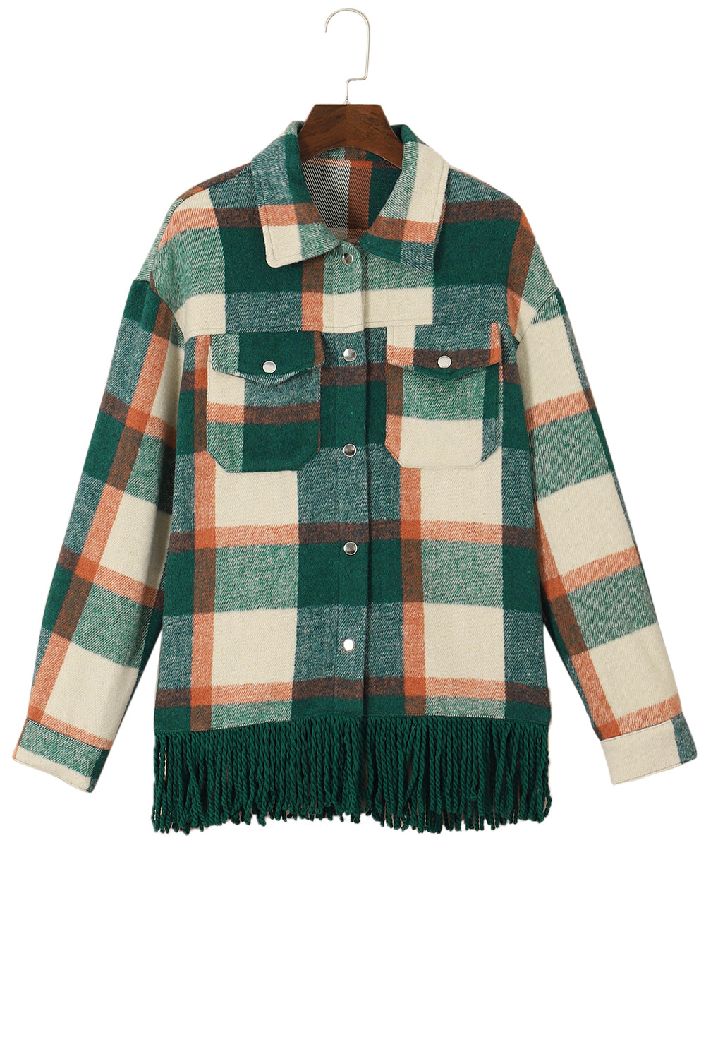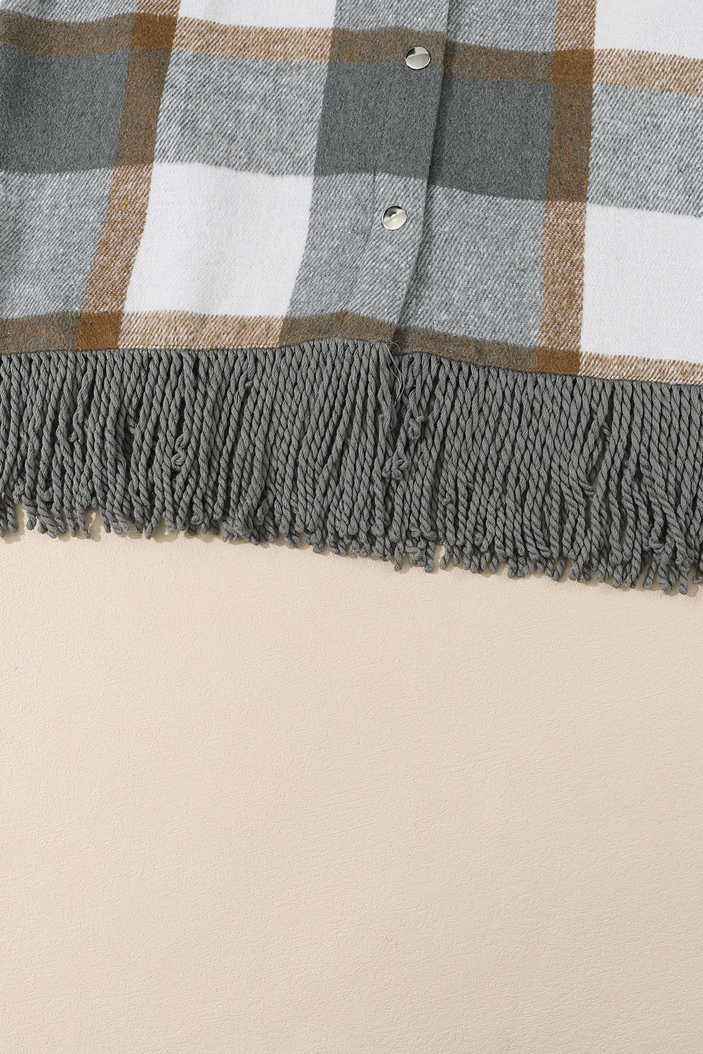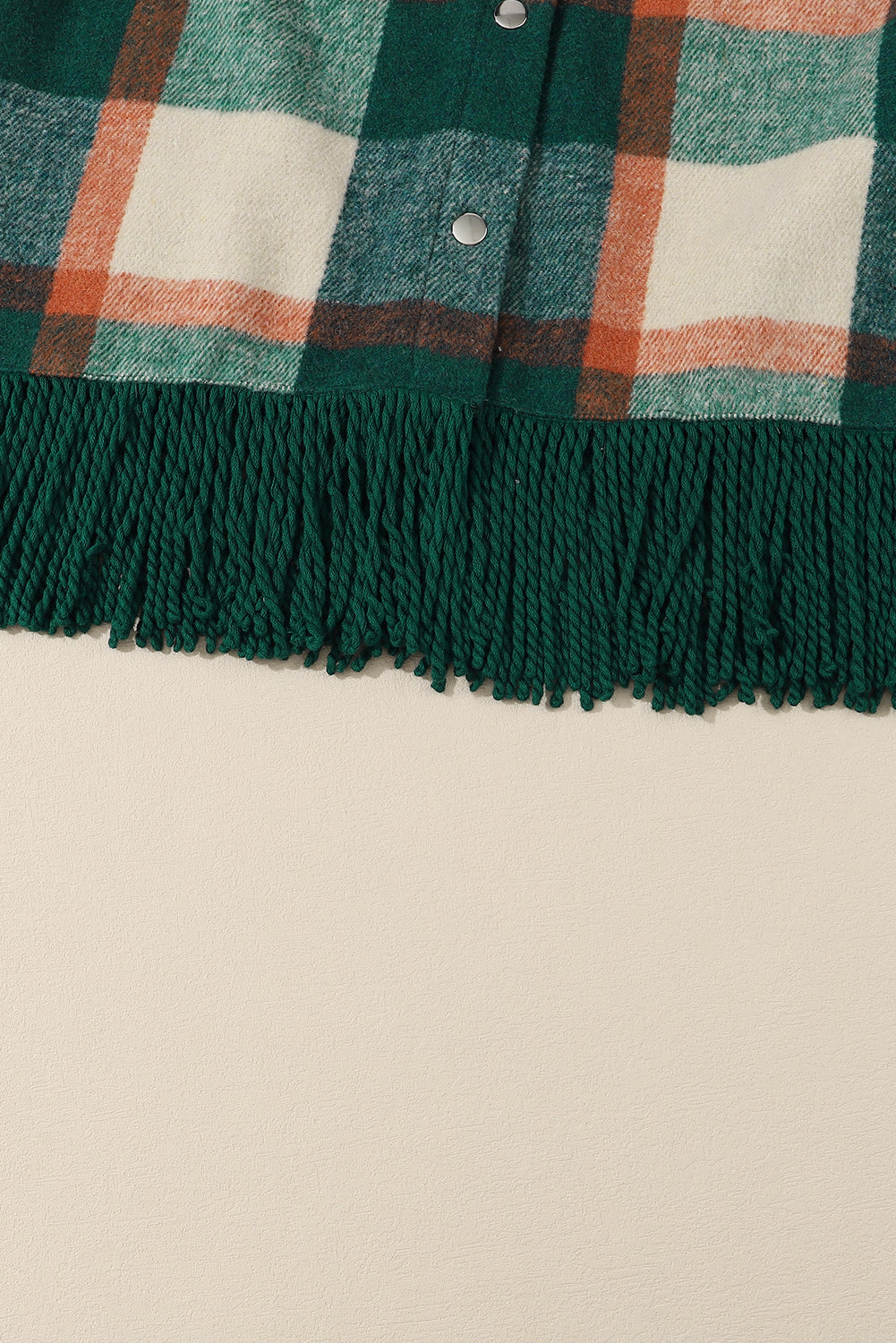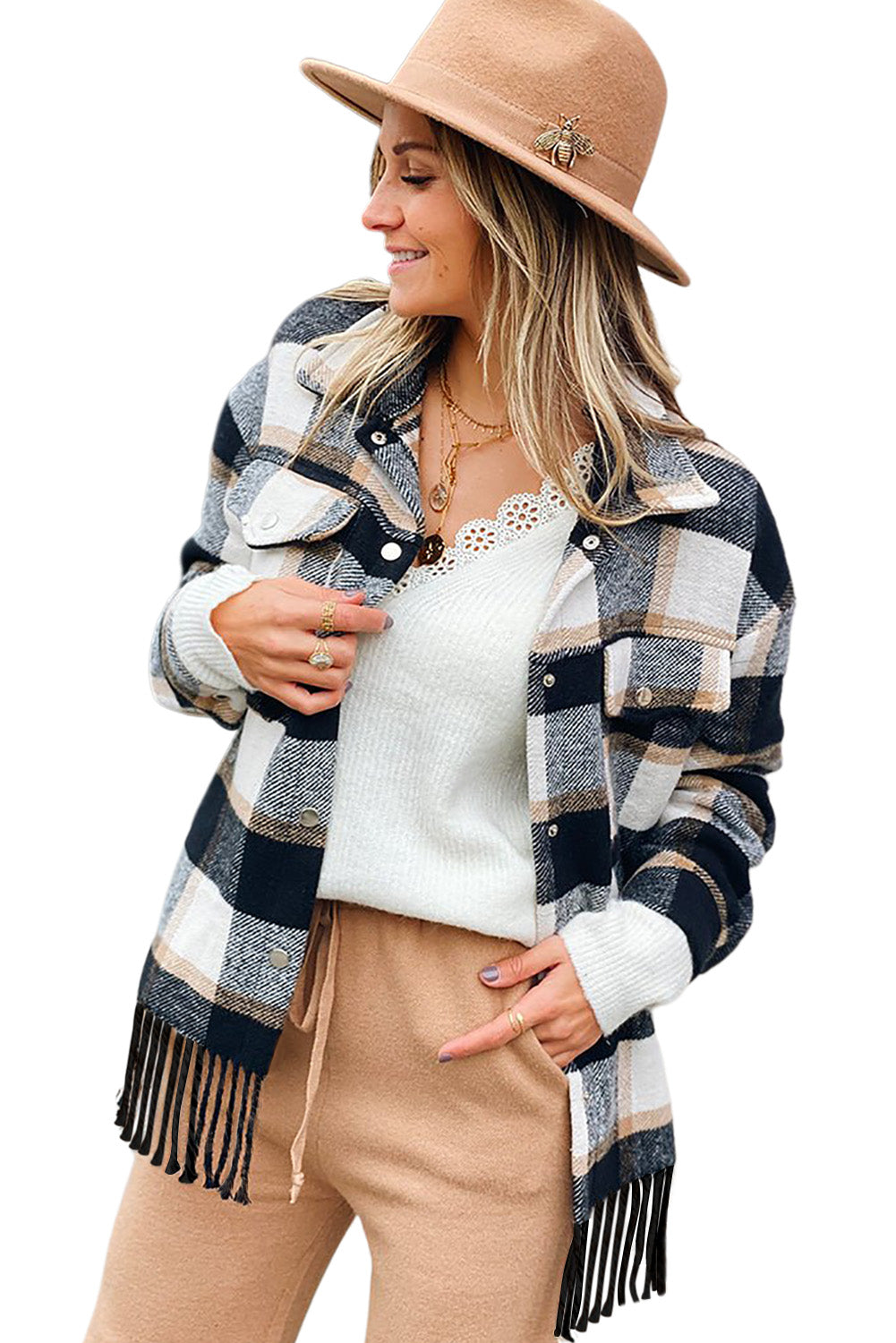 Chaqueta negra con dobladillo con flecos y bolsillo con botones a presión a cuadros