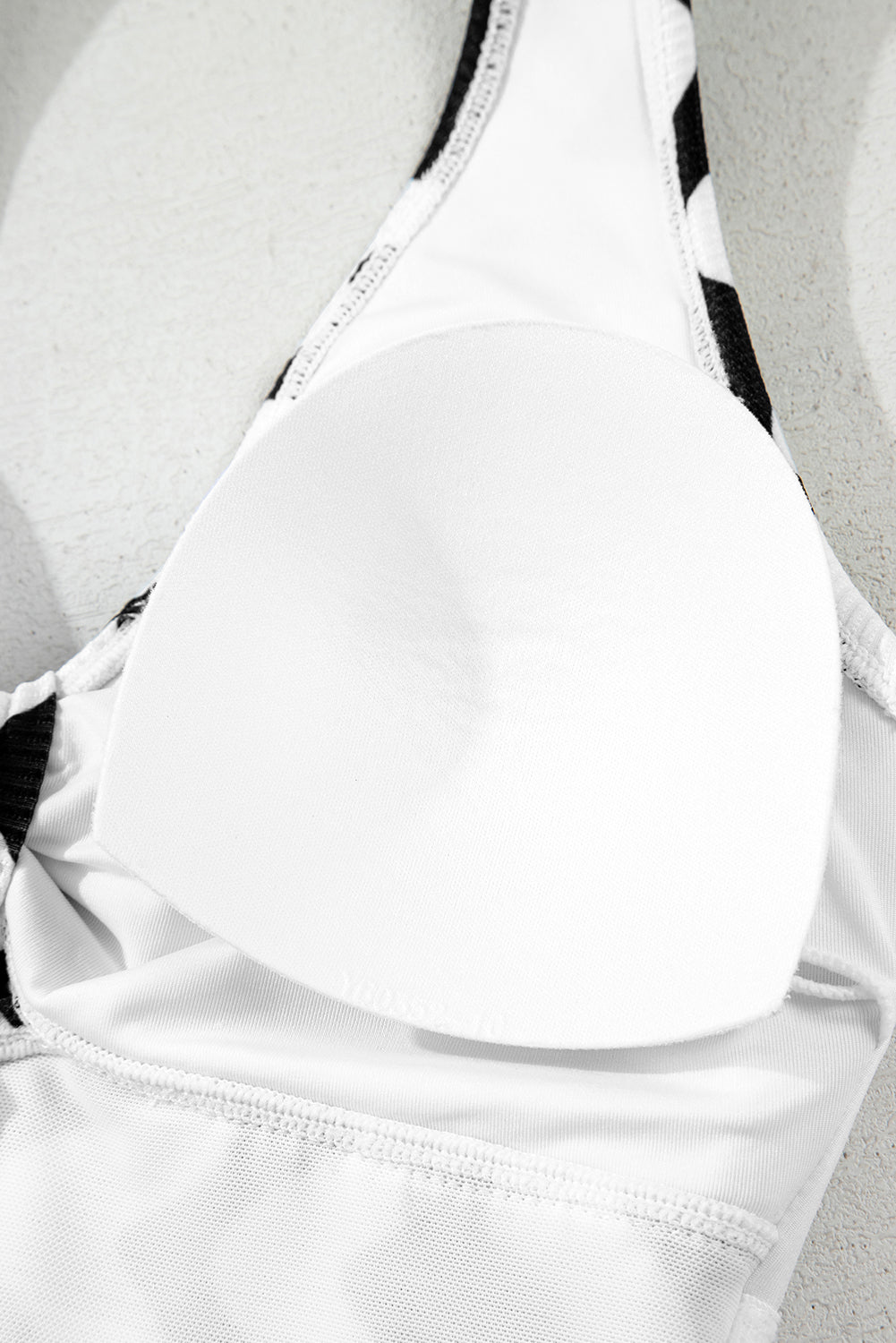 Black Stripe Bowknot Ricrac Print V Neck Low Back Cut One Piece Swimsuit