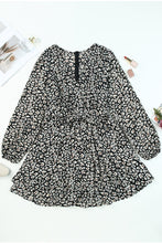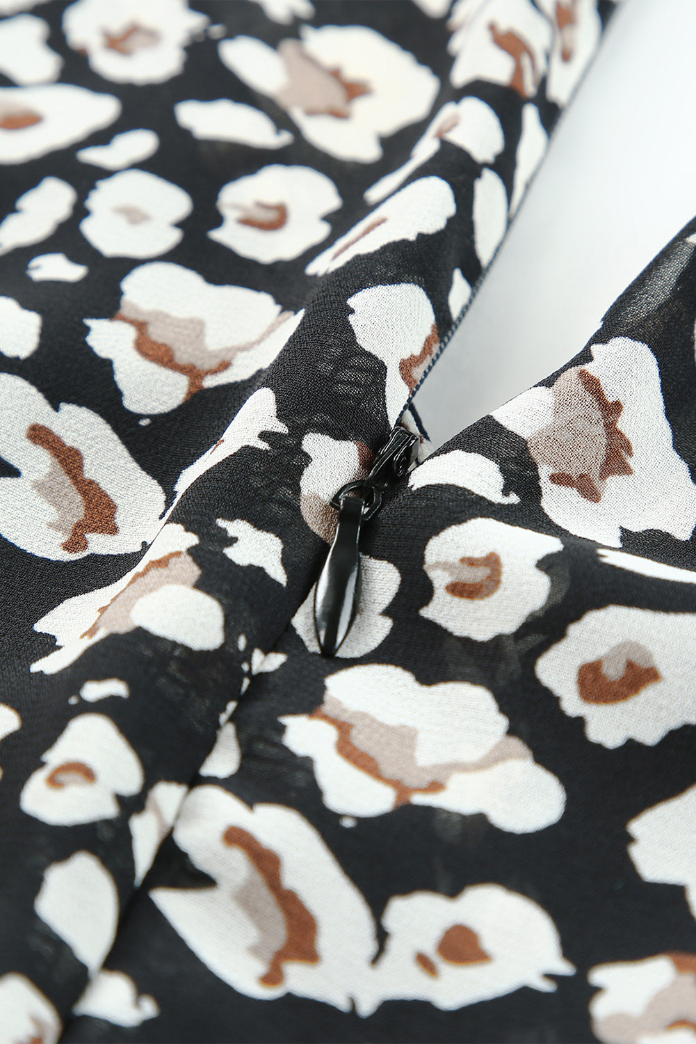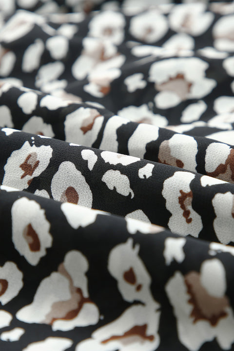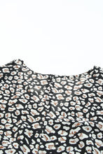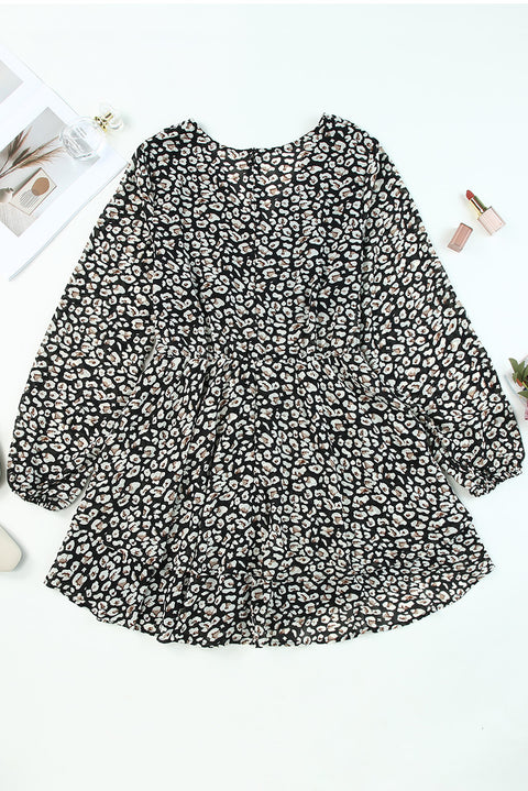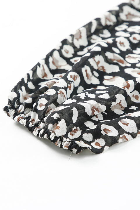 Black V Neck Baggy Sleeve Waist Tie Double Layer Ruffle Hem Leopard Print Dress