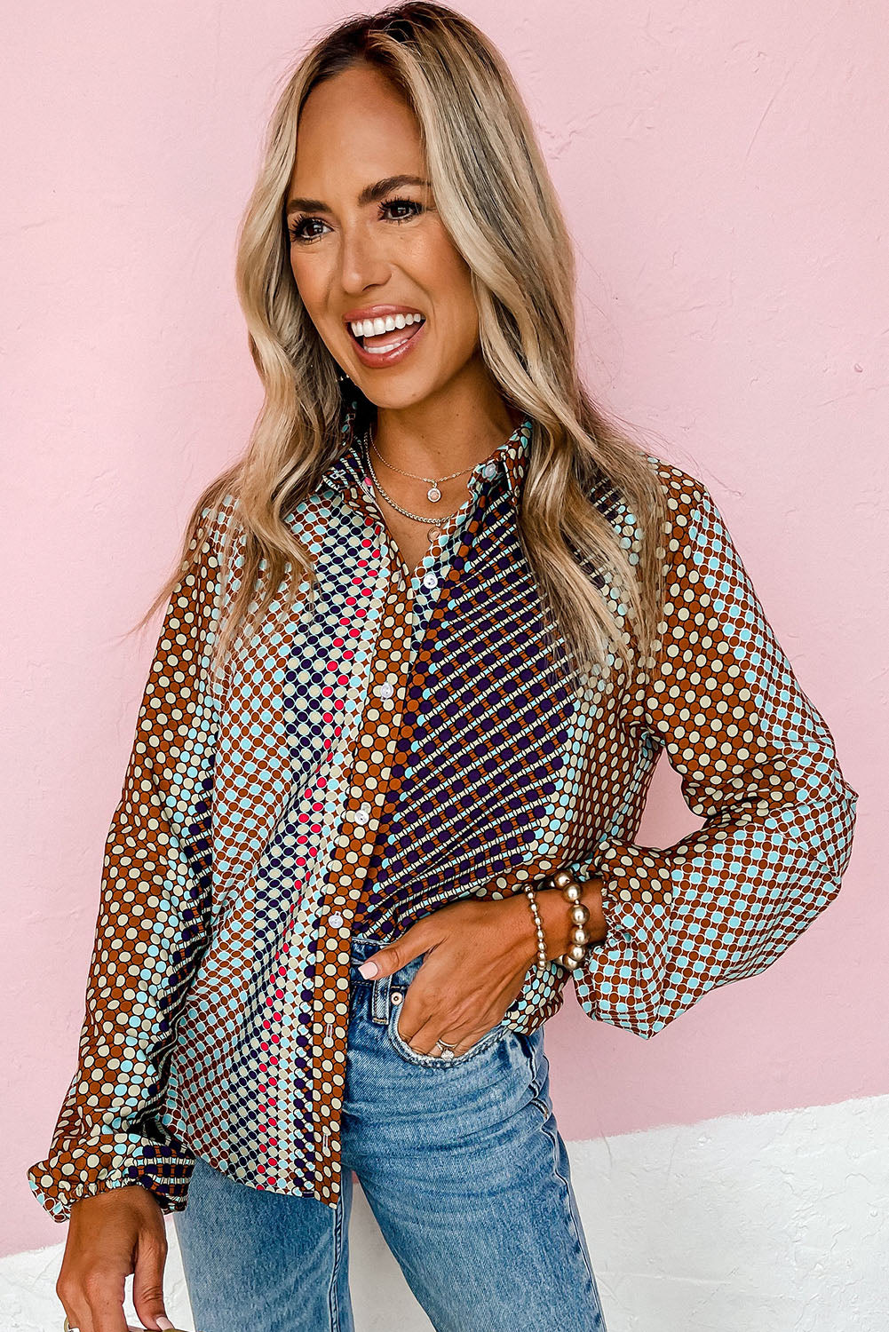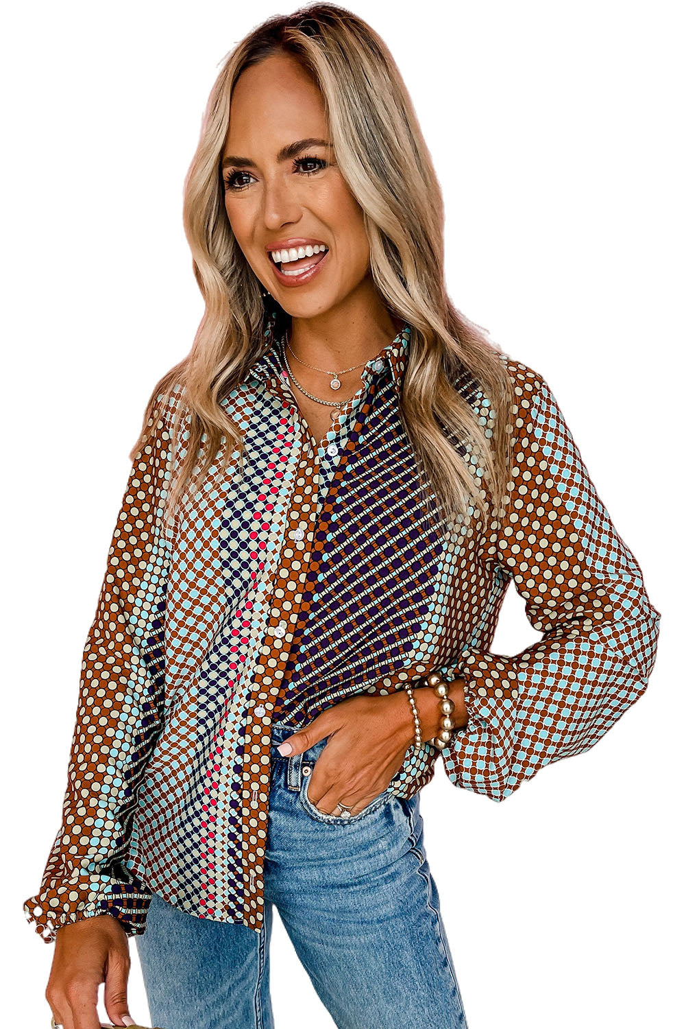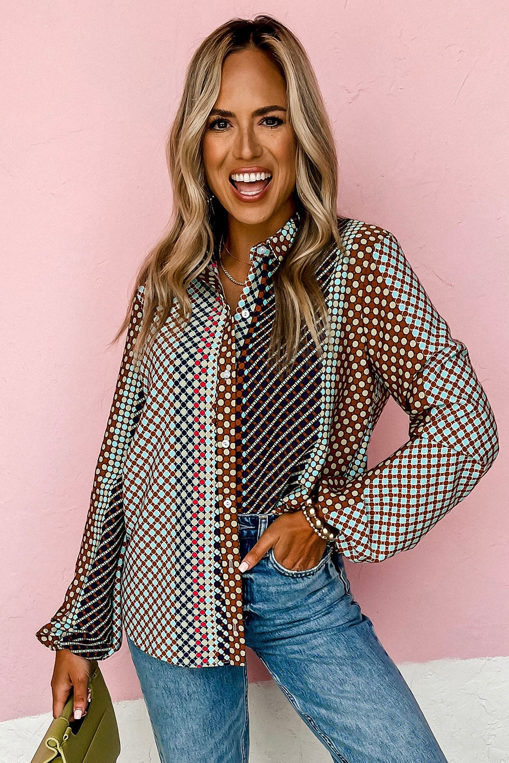 Camisa recta con botones de manga larga con estampado de puntos marrón