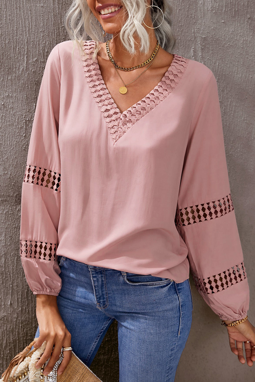 • La blusa para mujer tiene un aspecto elegante y sexy con cuello en V profundo, detalles huecos, mangas de burbuja y estilo holgado.