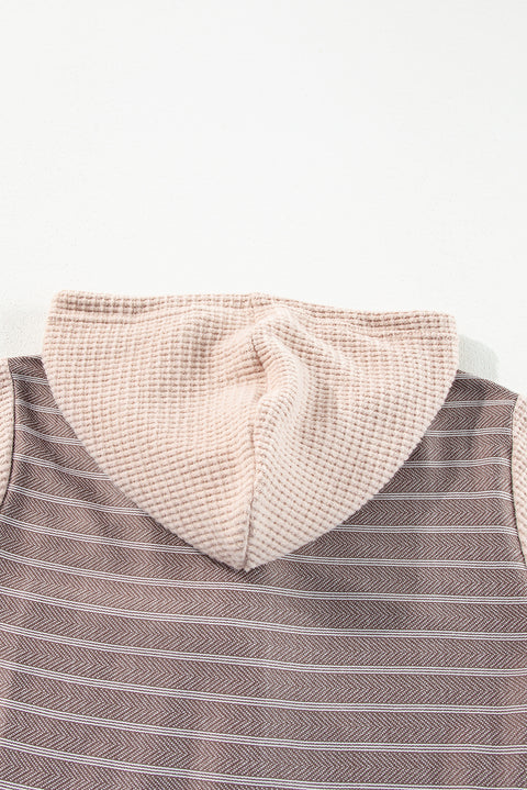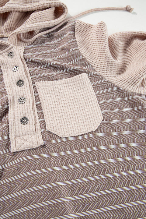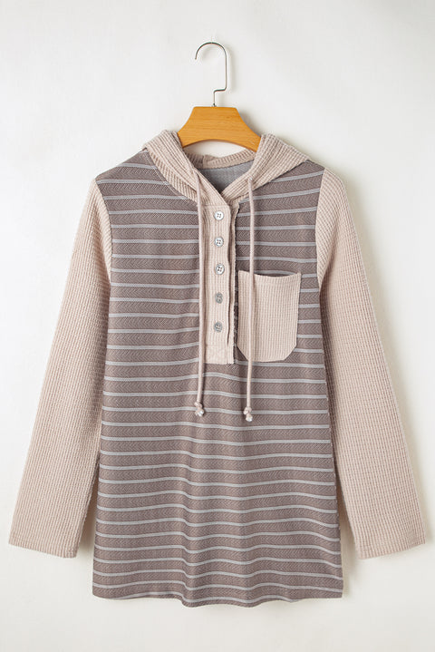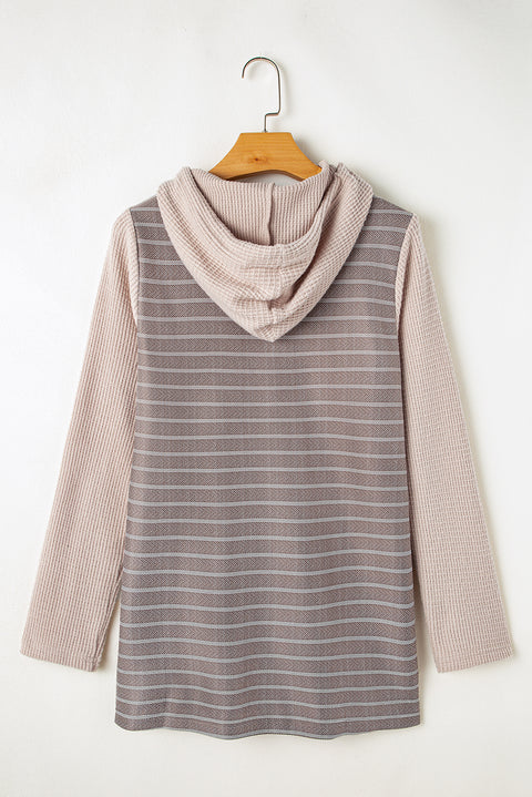 Gray Textured Knit Colorblock Striped Henley Hooded Top