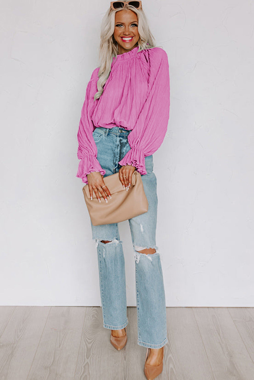 - Los puños acampanados y los llamativos detalles plisados hacen que esta blusa luzca dulce y a la moda.
