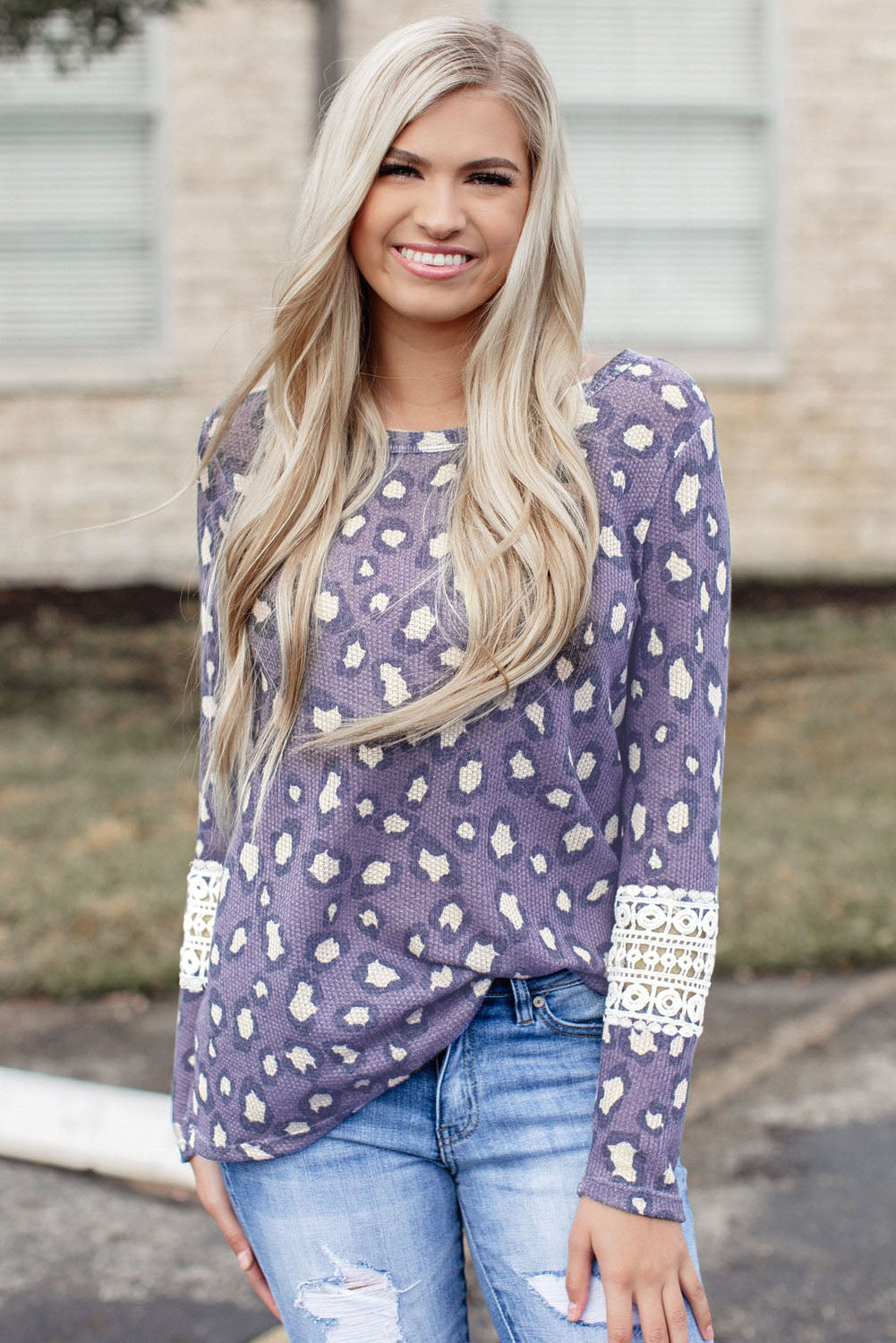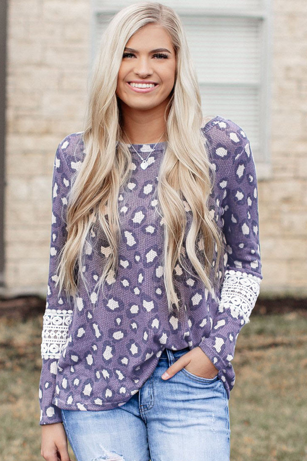 Top de manga larga de punto gofrado calado de encaje