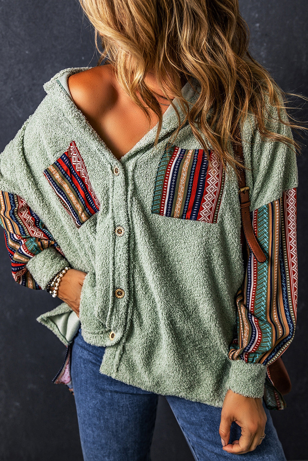 Laurel Green Contrast Printed Insert Button Fleece Hooded Jacket