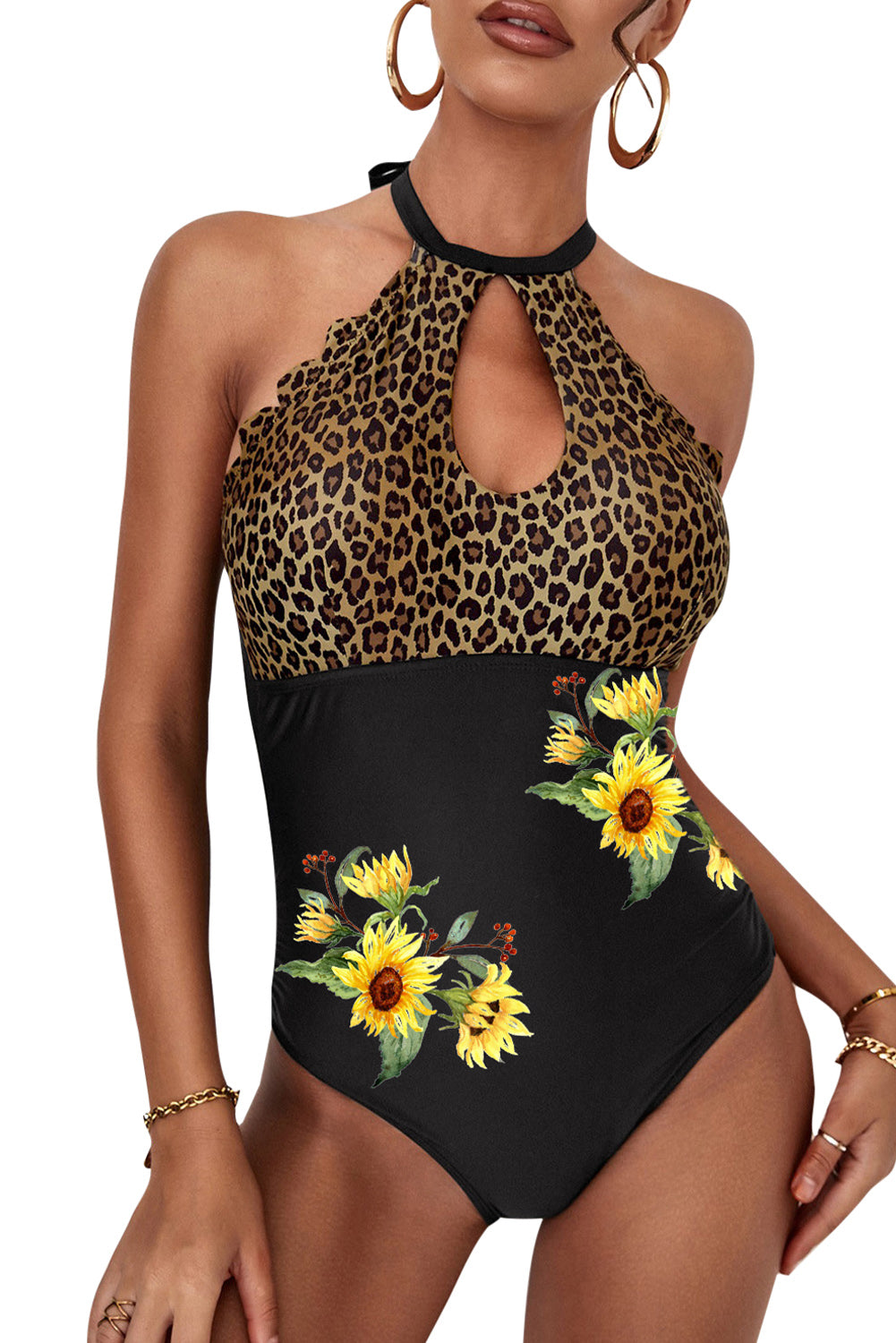 Bañador de una pieza ahuecado con ribete festoneado de leopardo