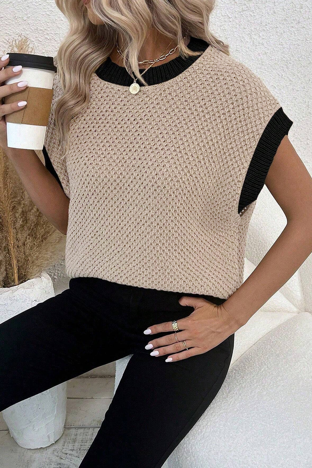 Light French Beige Contrast Trim Round Neck Batwing Sleeve Sweater Top