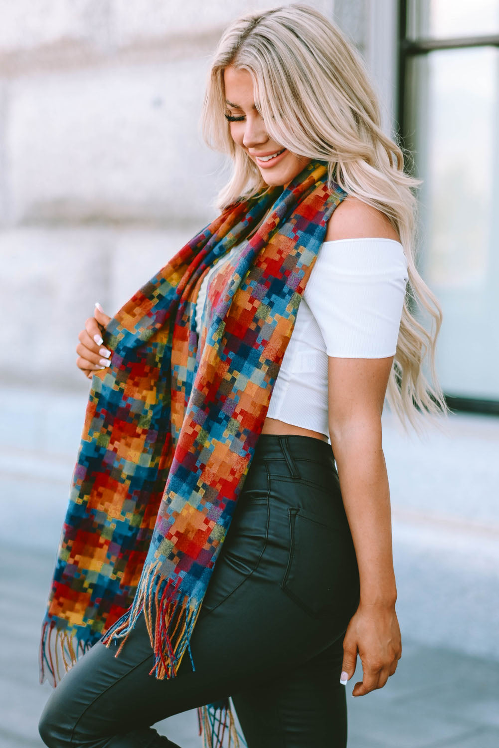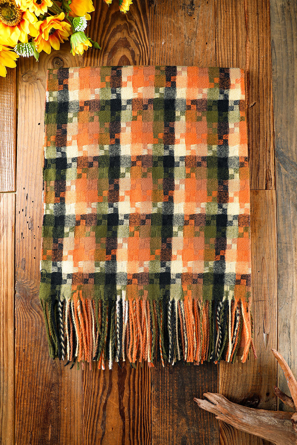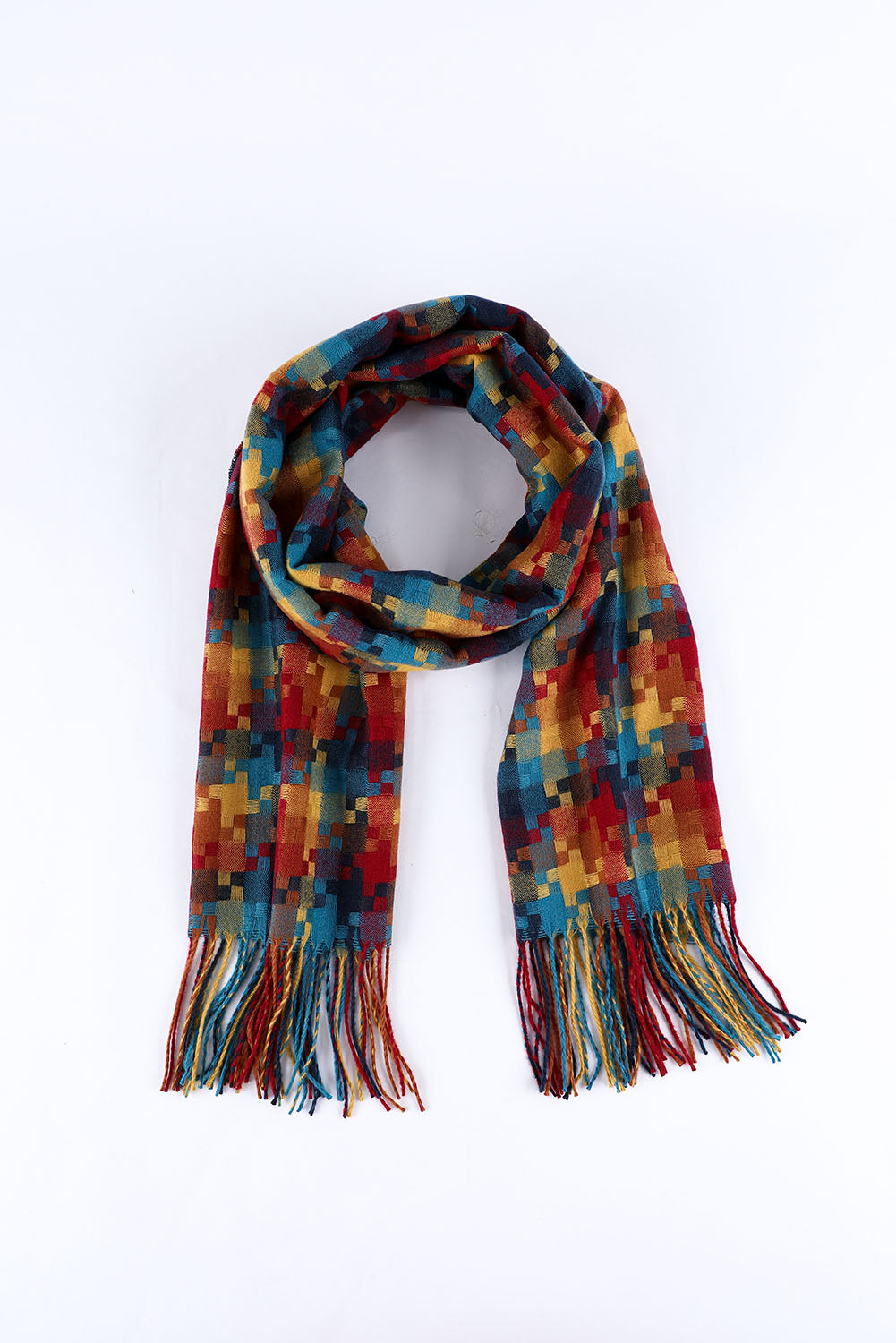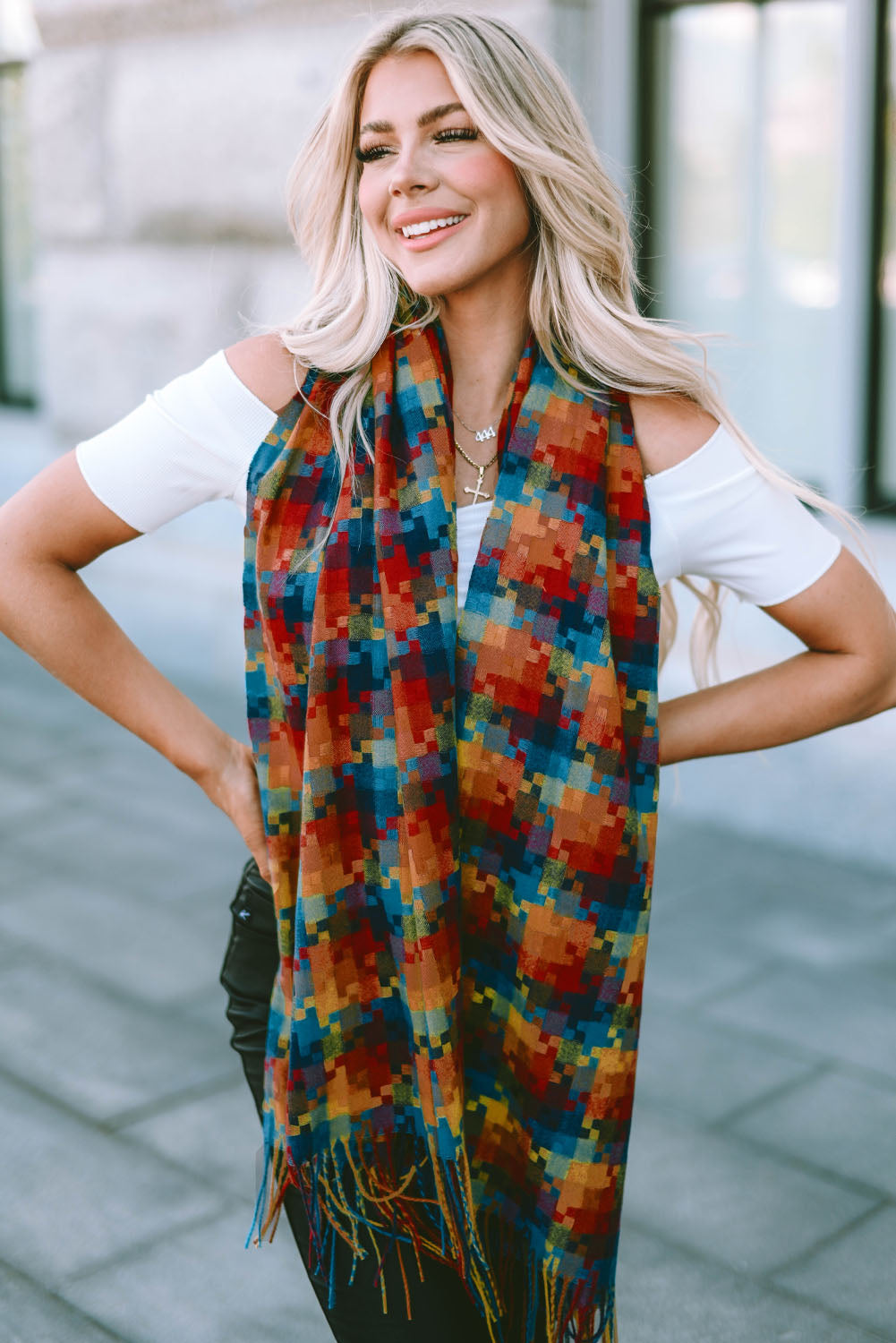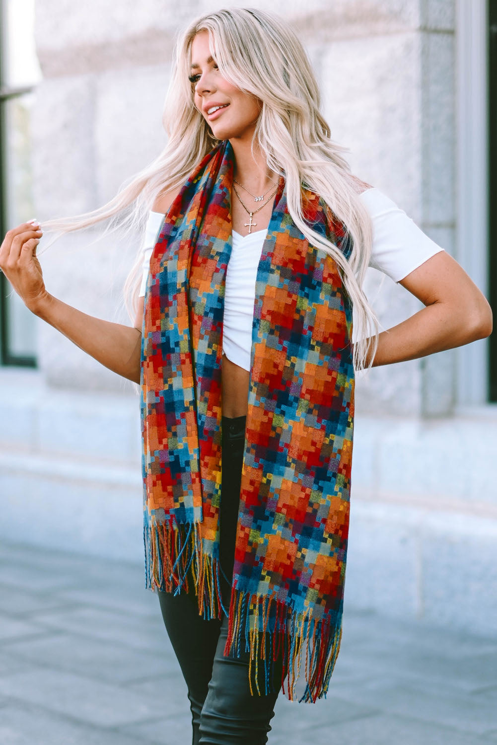 Bufanda con dobladillo con flecos y estampado de cuadros multicolor