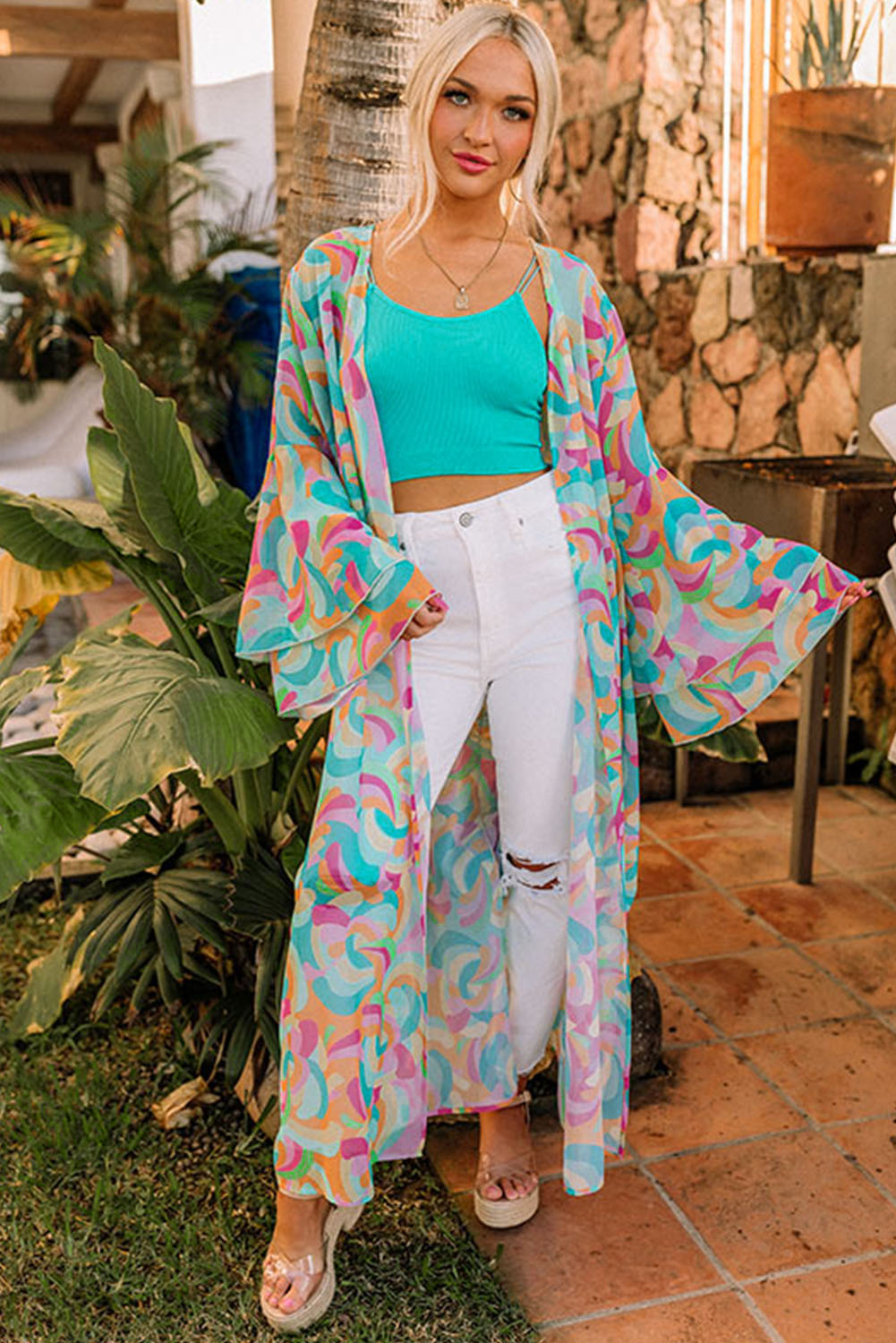 Cárdigan fluido largo con manga acampanada de doble capa y estampado multicolor