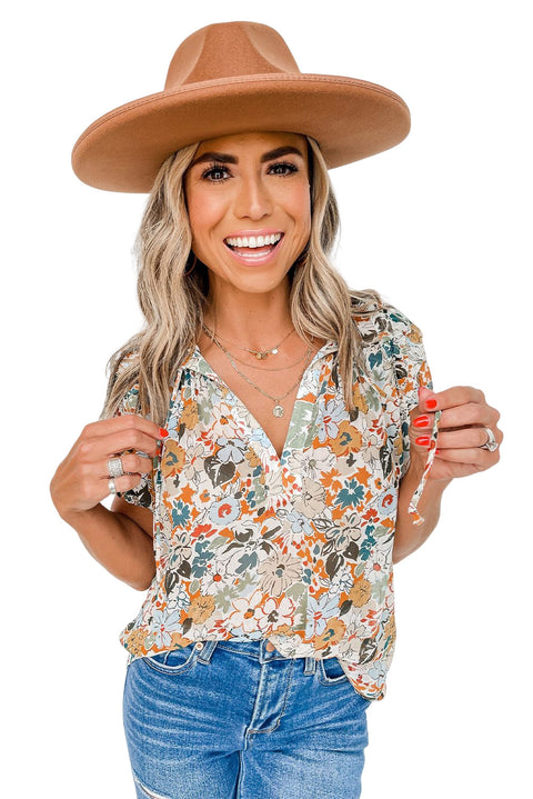 Blusa con estampado de flores y manga abullonada con cuello en V dividido multicolor