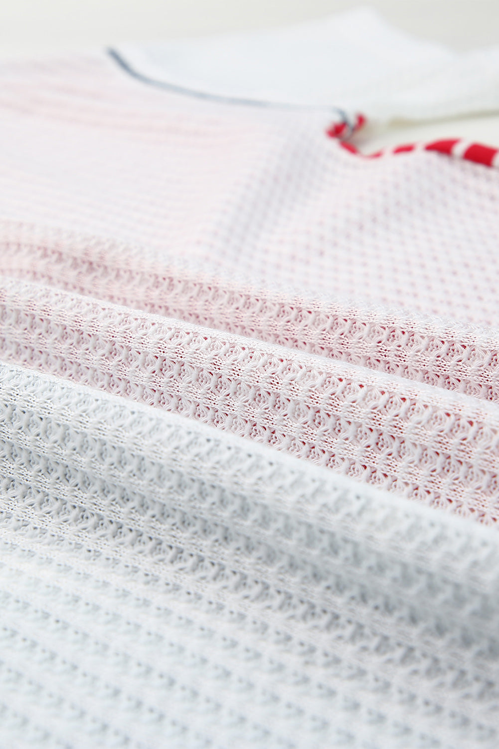 - Los bloques de color añaden un toque de contraste al material tejido.