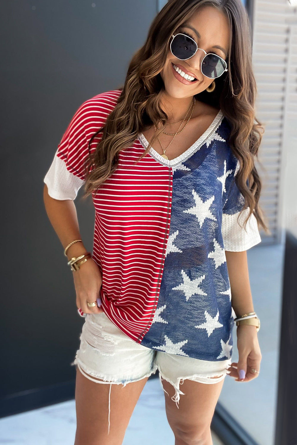 Top de manga corta de punto con estampado de estrellas y rayas multicolores