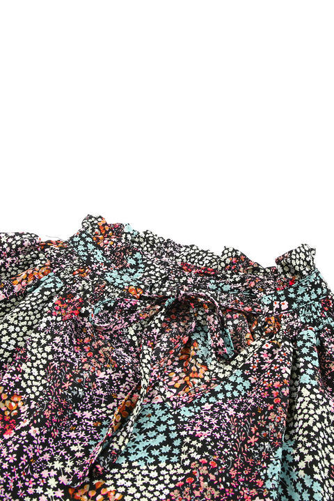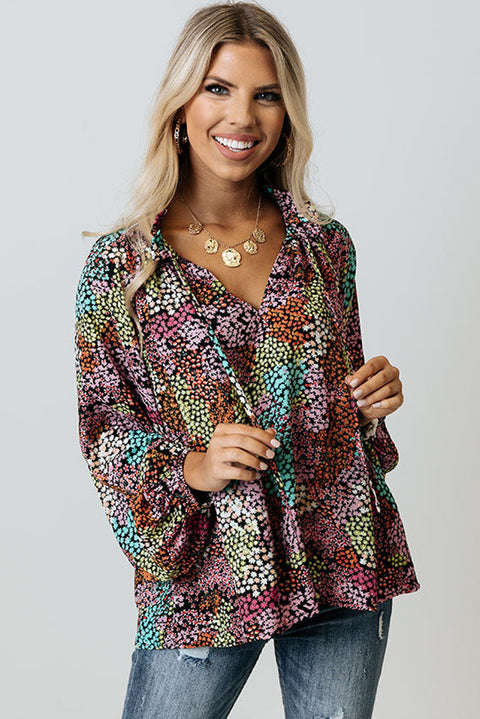 Blusa con cuello en V y mangas abullonadas con lazo floral vibrante multicolor