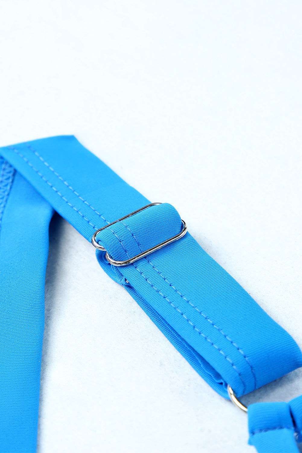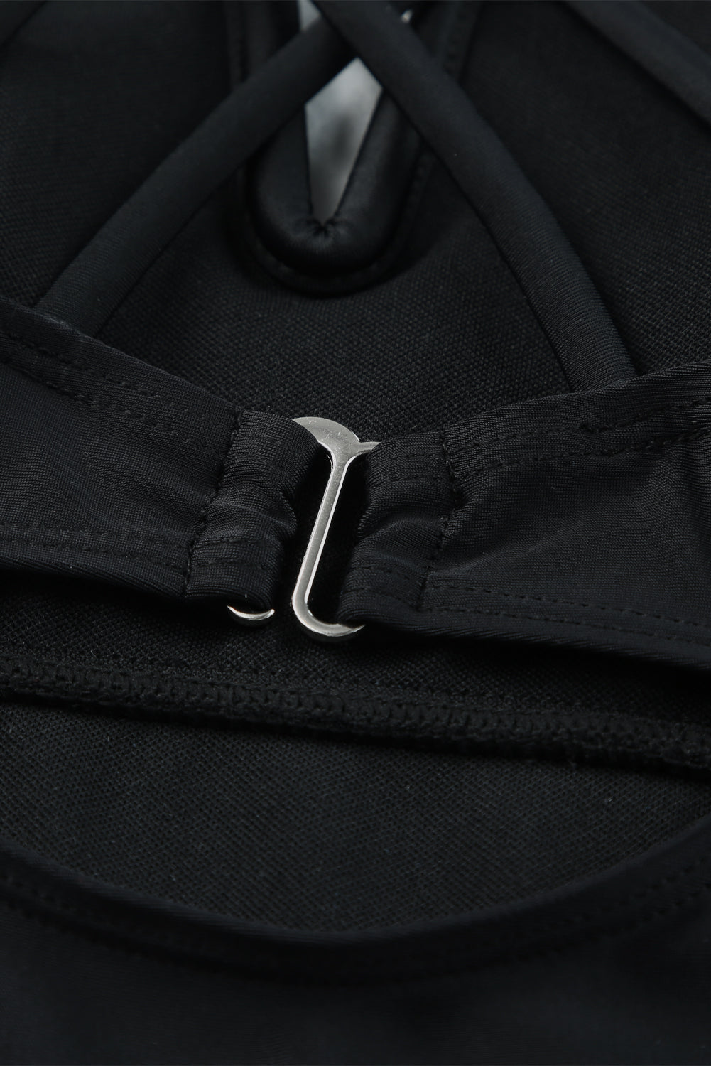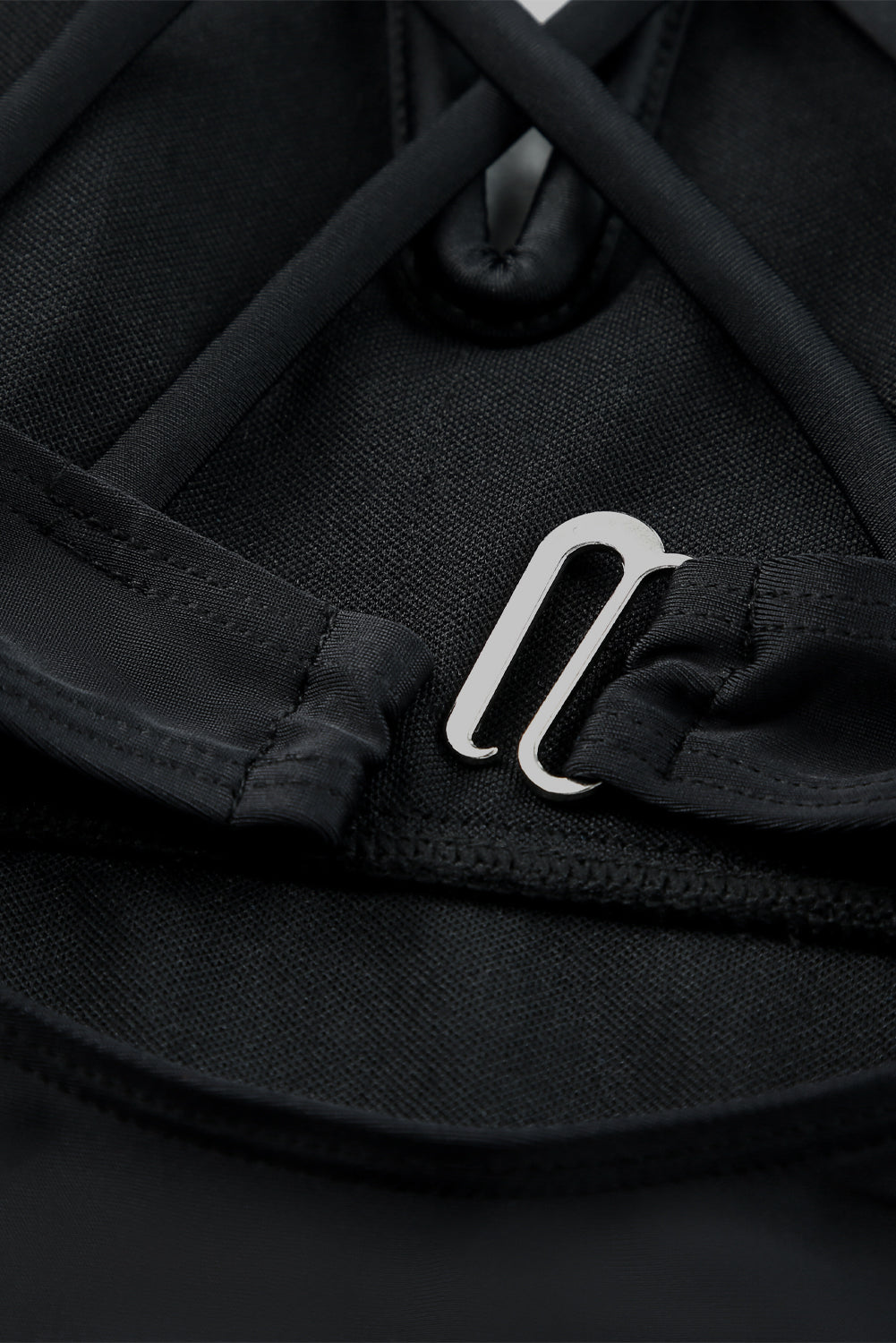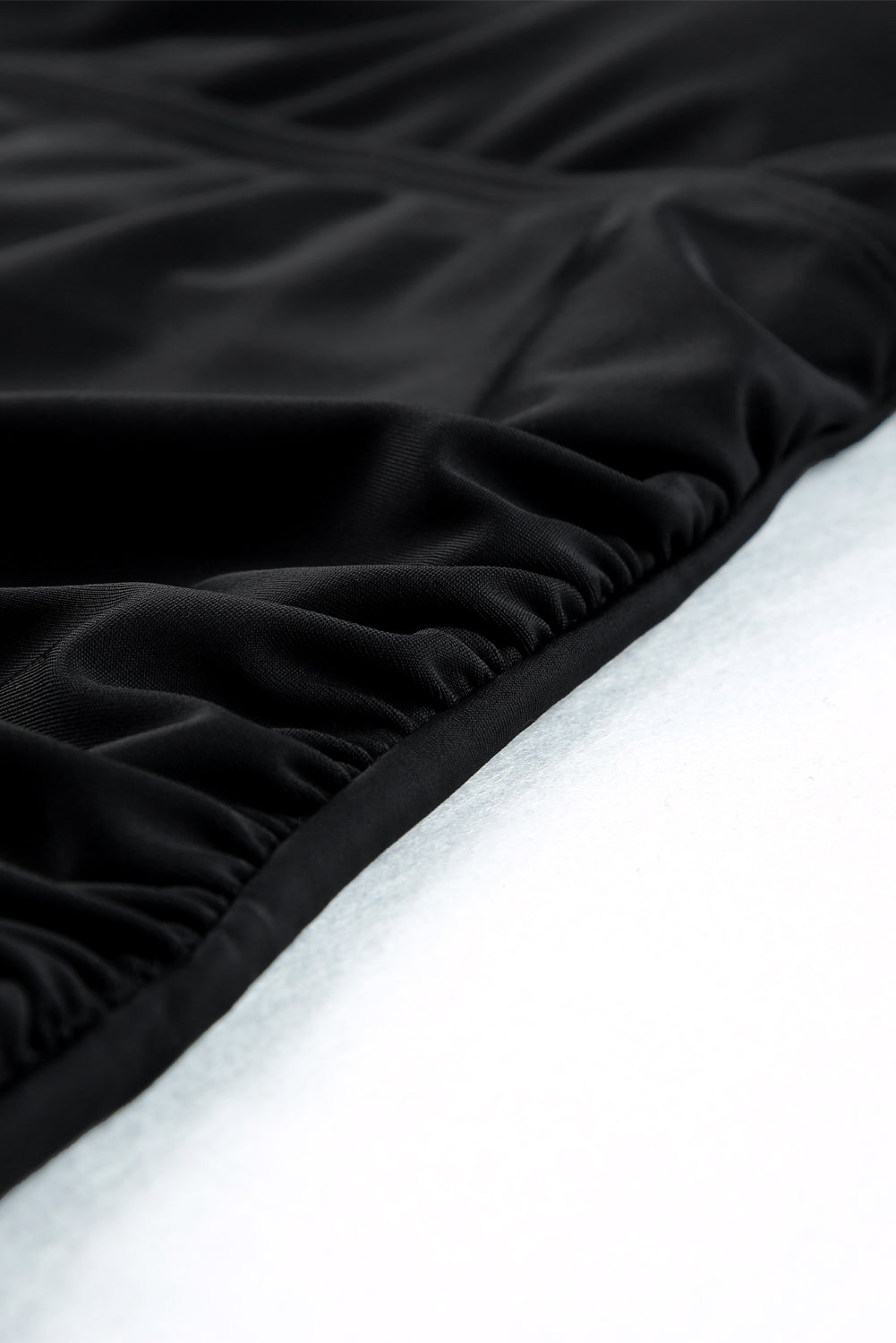 •El top de baño fruncido presenta un escote en V y espalda con tiras y cierre de gancho.