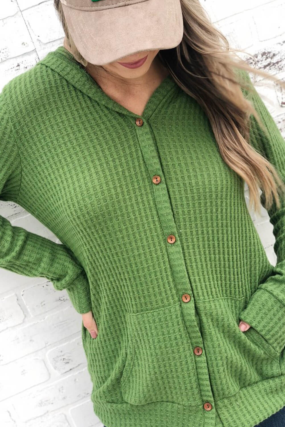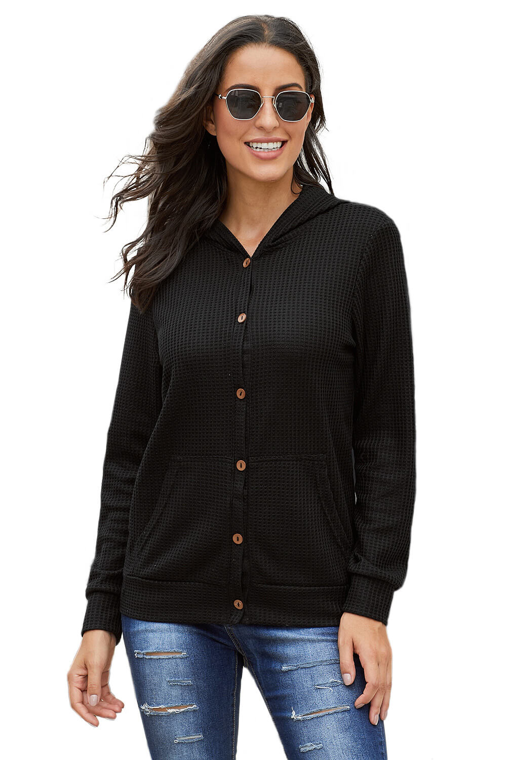 •Cárdigan con frente abierto y ajuste relajado, cierre de botones y bolsillos laterales.