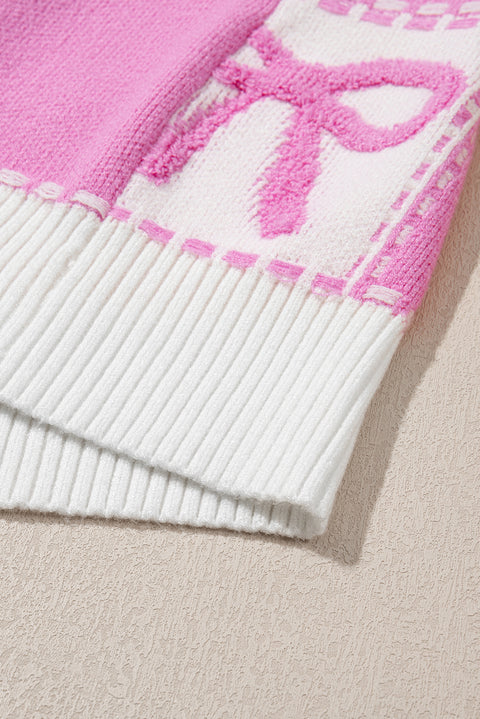 Pink Bow Knot Two Tone Checkered Crew Neck Sweater