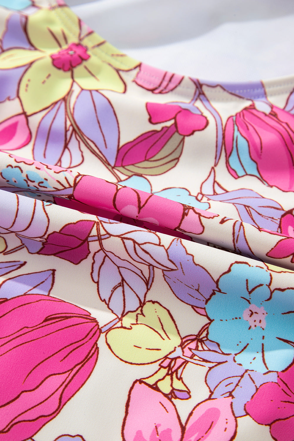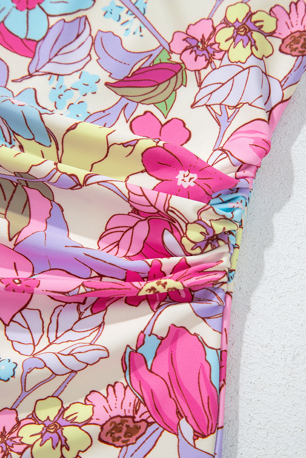 Pink Floral Ruffle Trim V Neck Lace-up Back Tummy Control One Piece Swimsuit