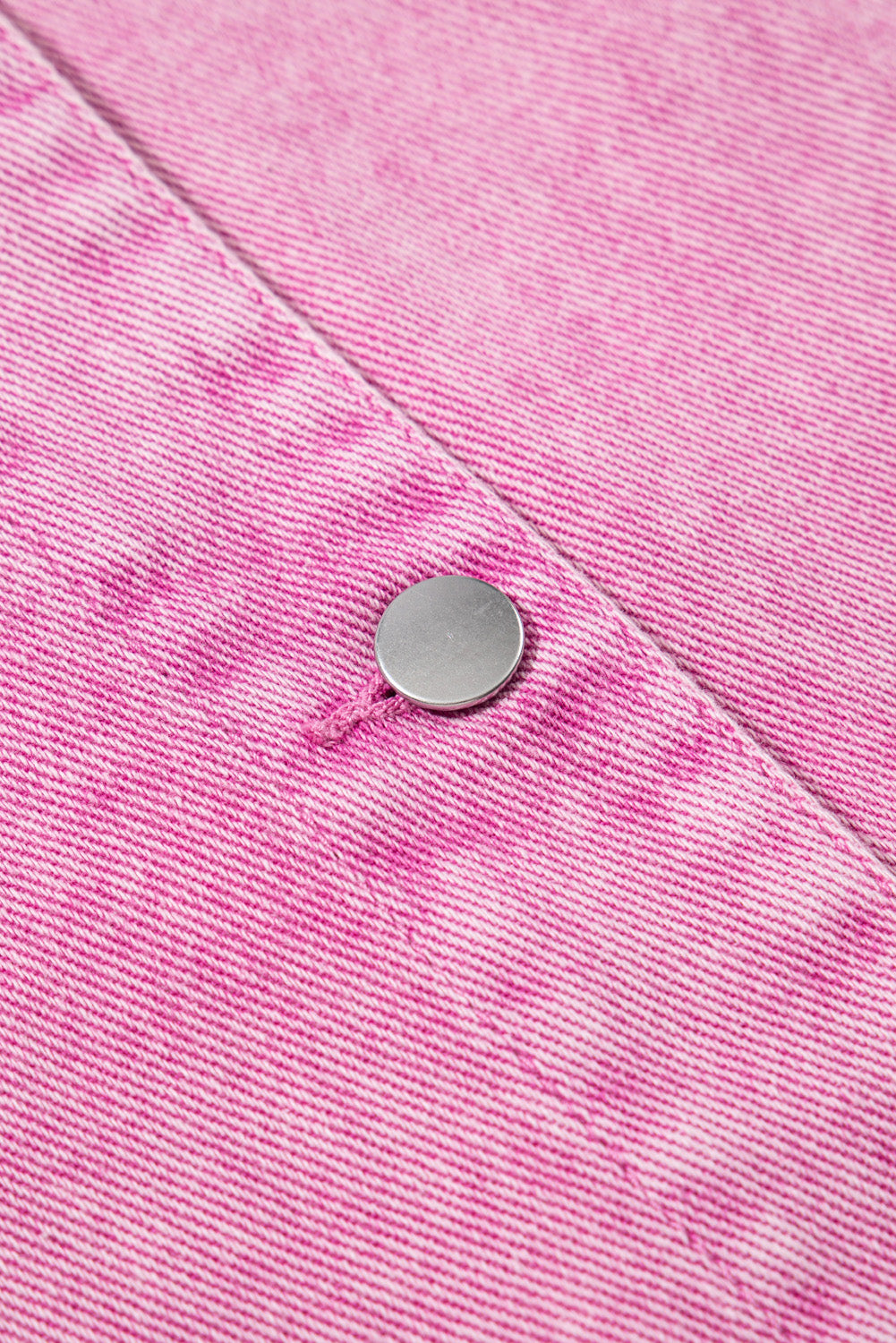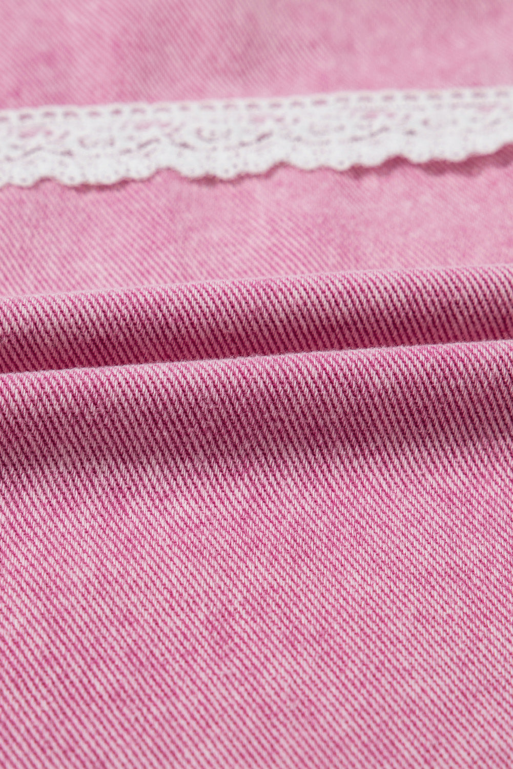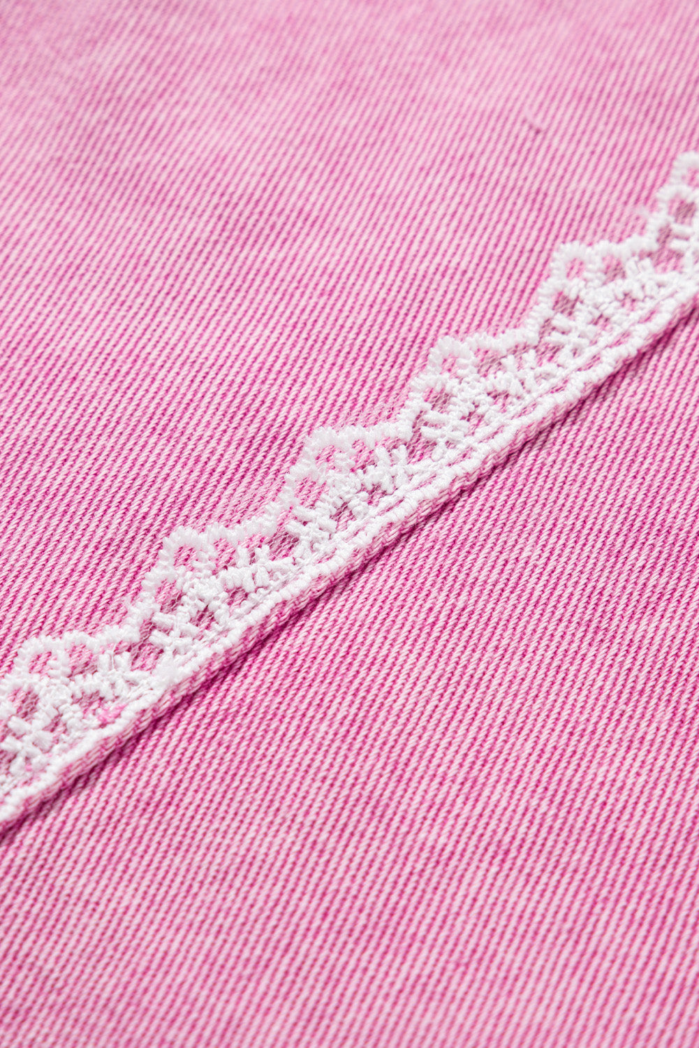 Pink Lace Patchwork Distressed Buttoned Denim Jacket