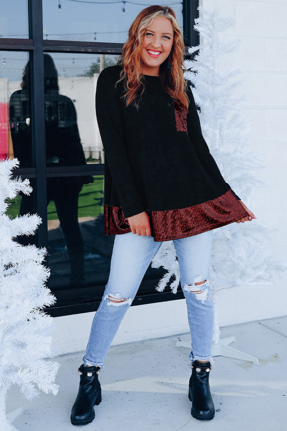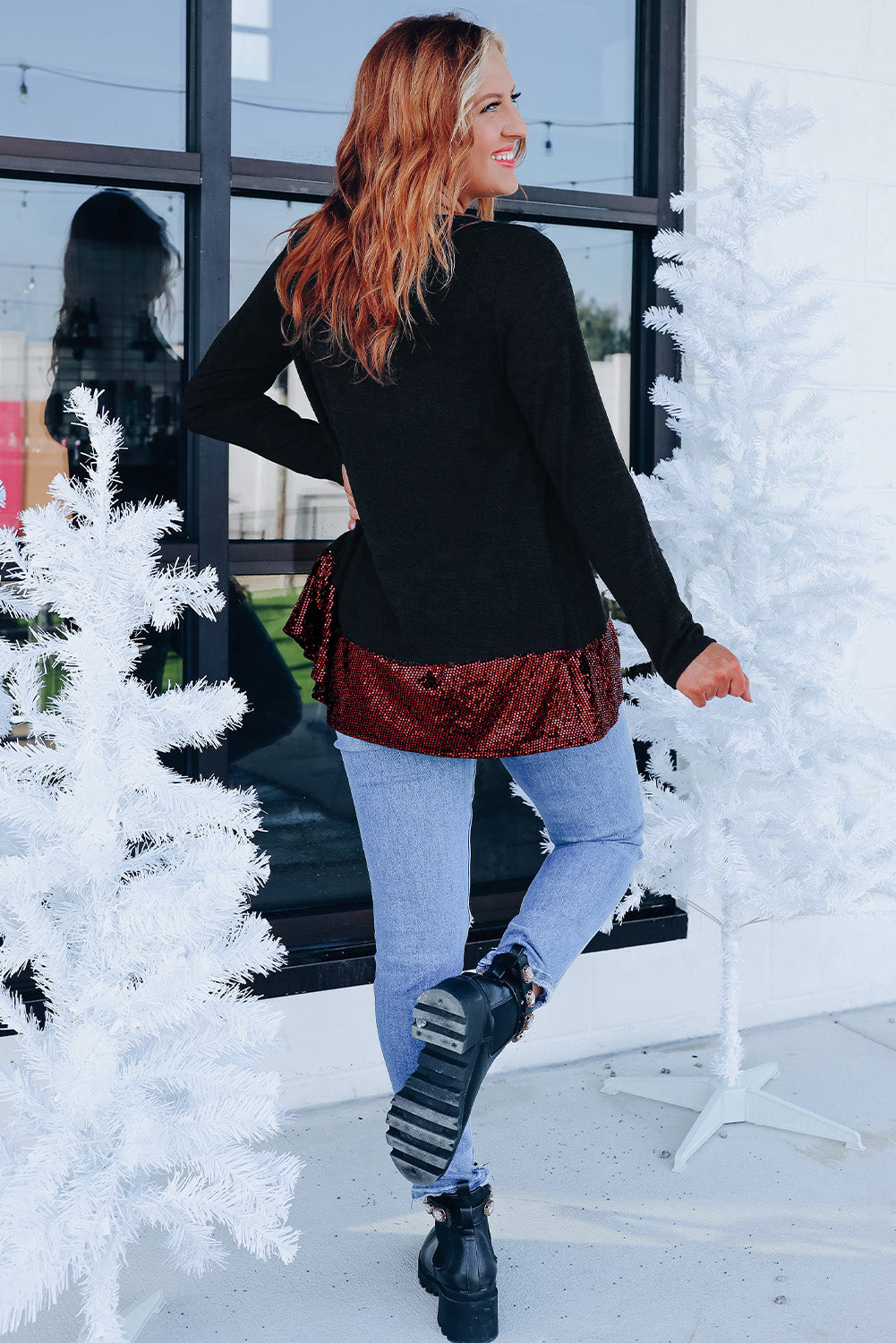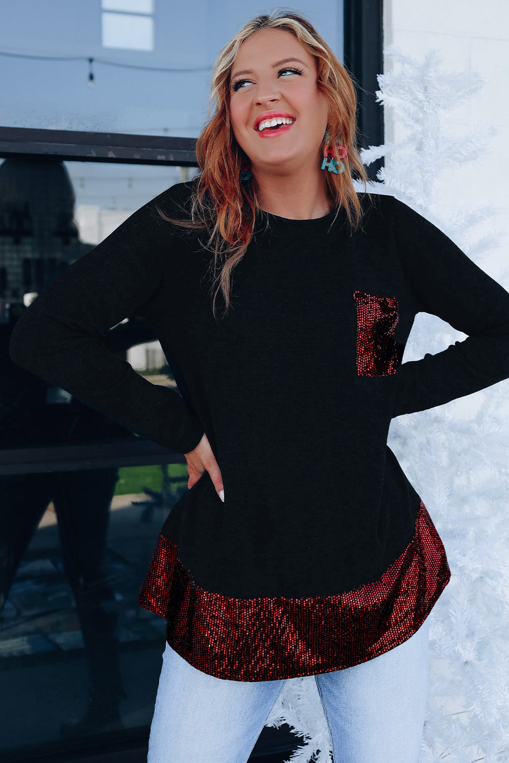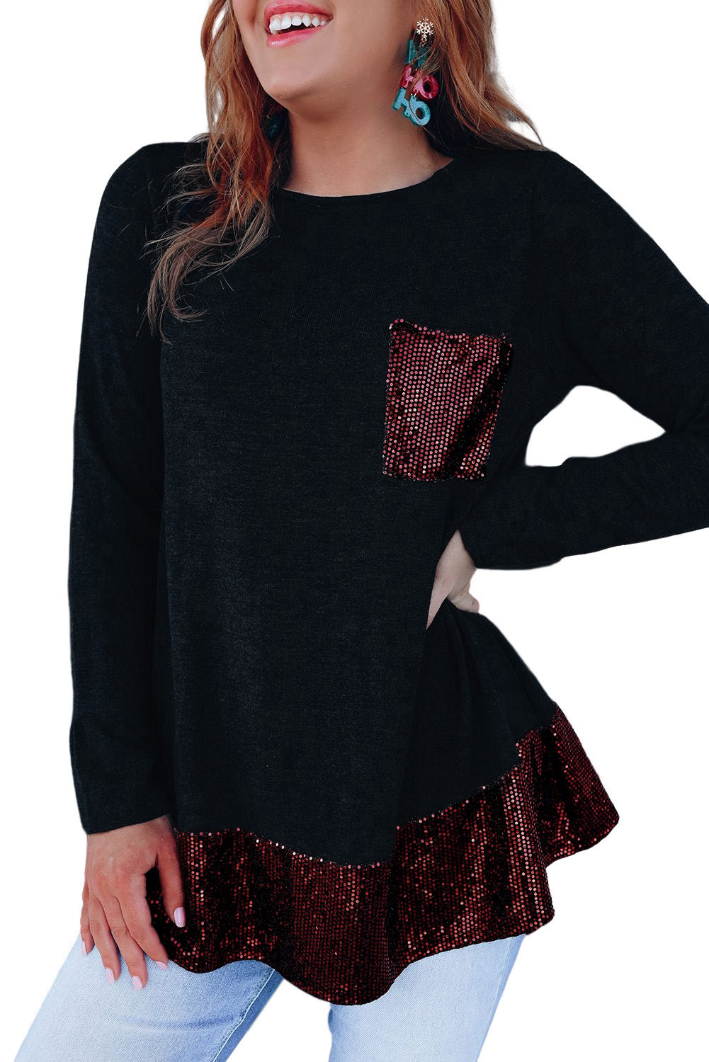 Top con dobladillo con volante y bolsillo de parche de lentejuelas