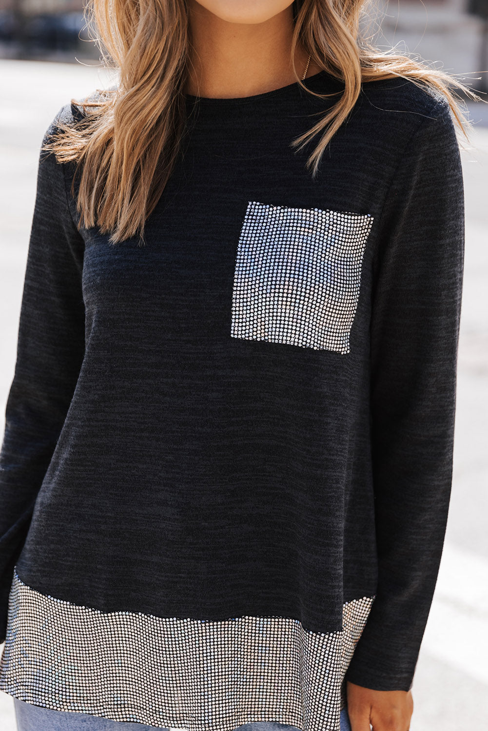 - Destacado con escote en V, manga larga, bolsillo en el pecho, lentejuelas y corte holgado.