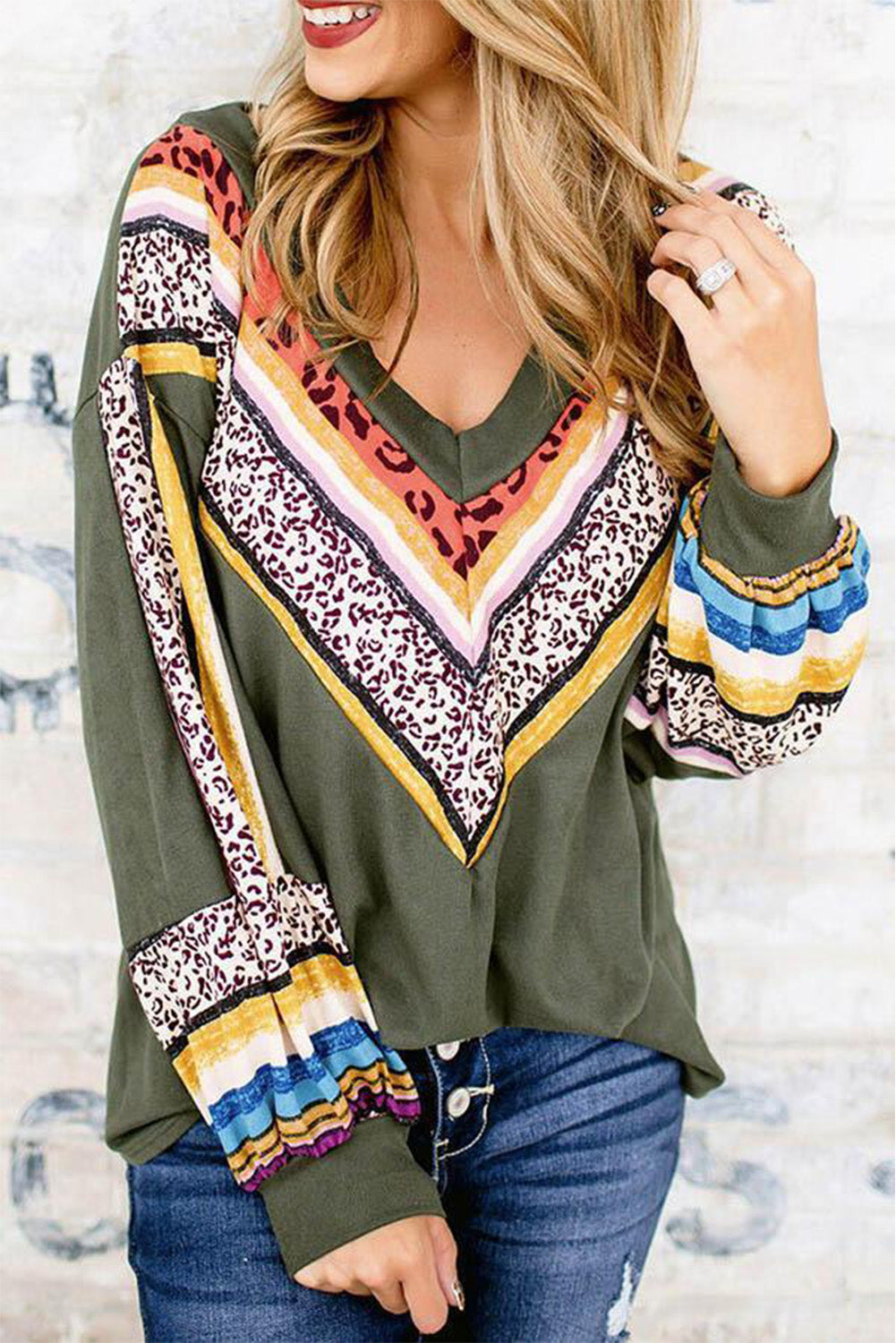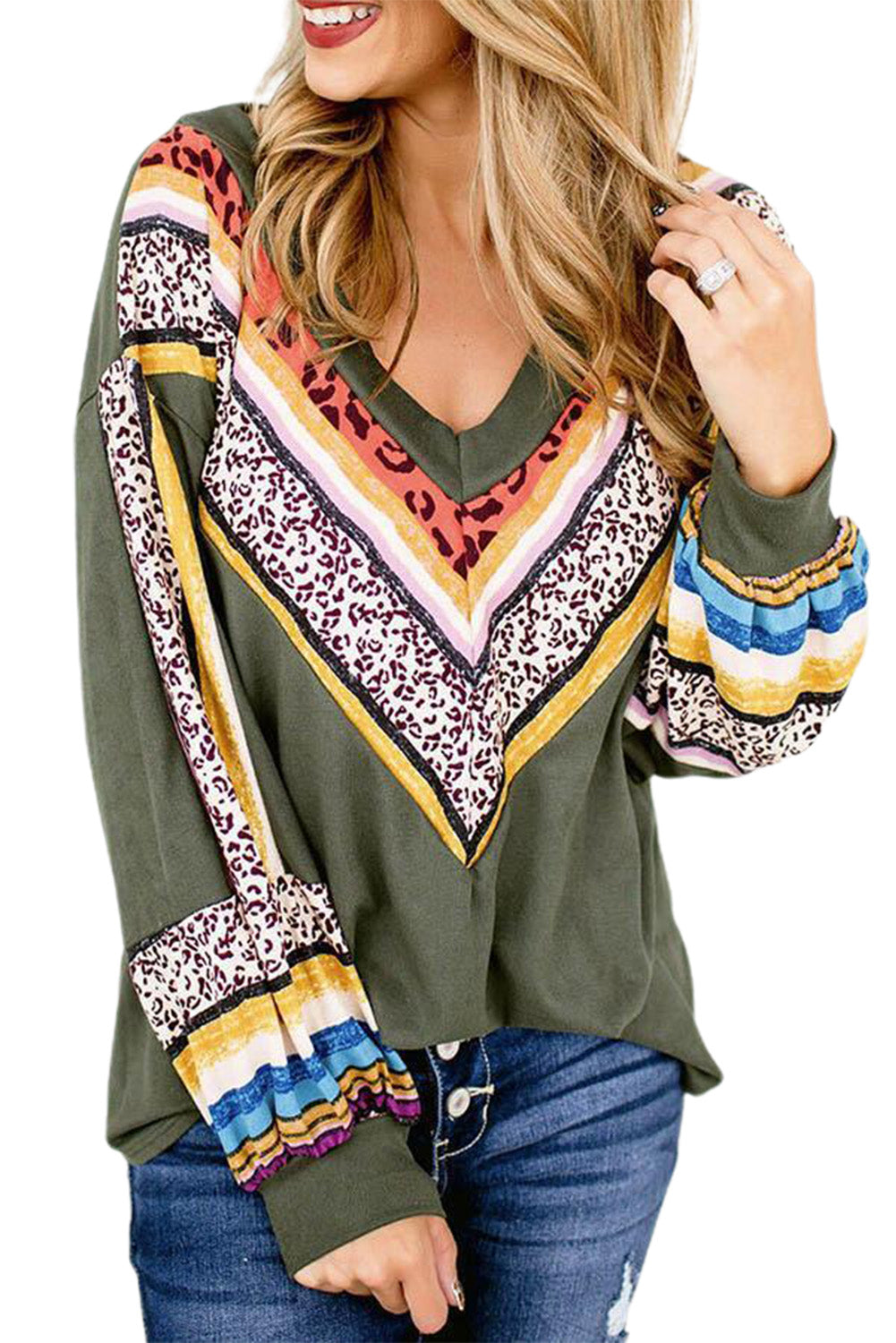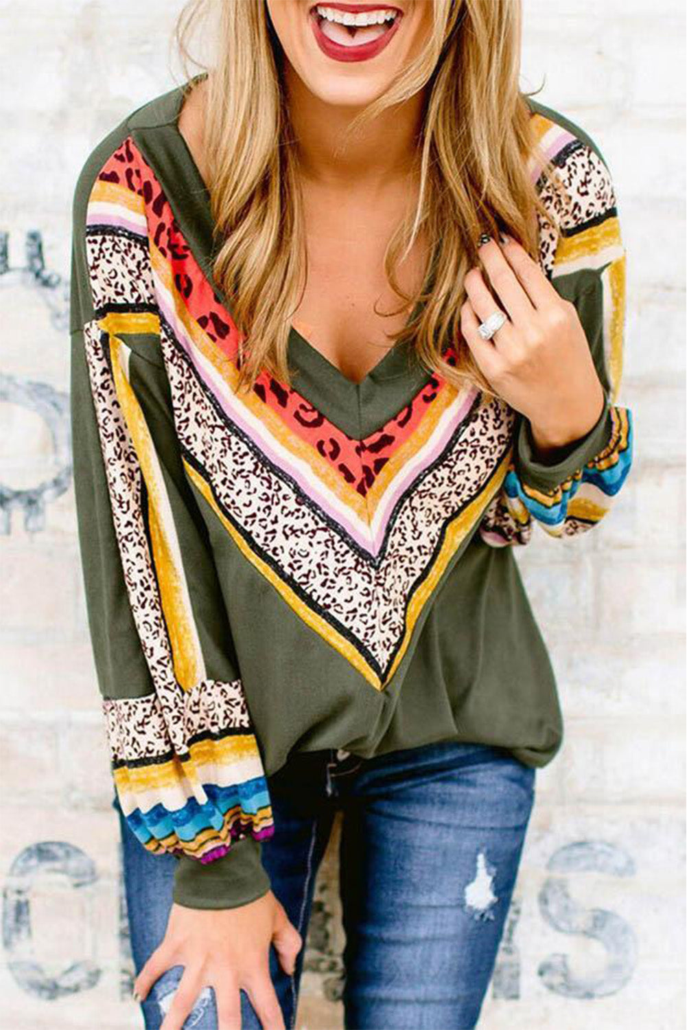 Top de manga larga con cuello en V y estampado de leopardo a rayas