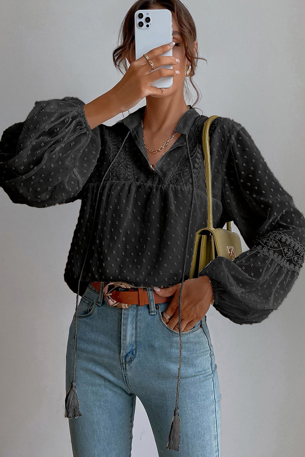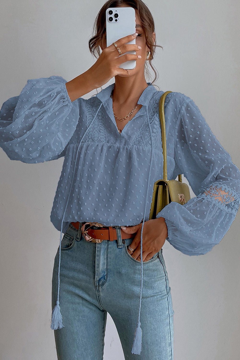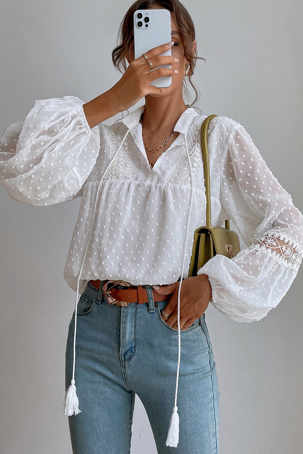 Blusa babydoll con manga globo y cordón de lunares suizos
