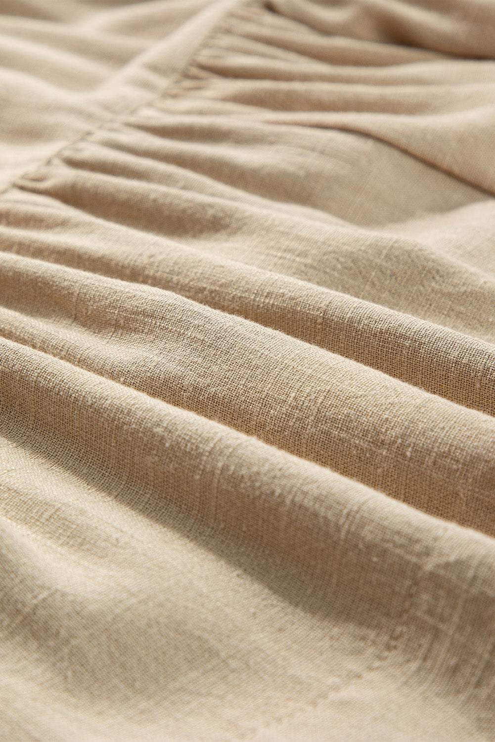 This tan mini dress features puff sleeves, buttoned front, and tiered pleating for a chic, feminine look. The lightweight fabric and flattering silhouette make it perfect for all-day wear. Elevate your style game with this versatile and trendy dress.