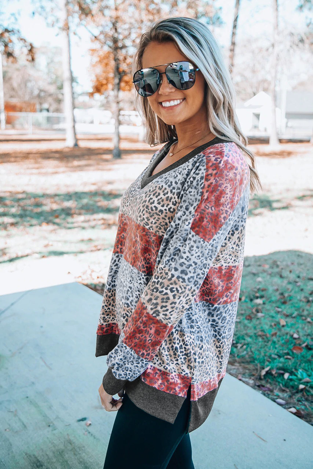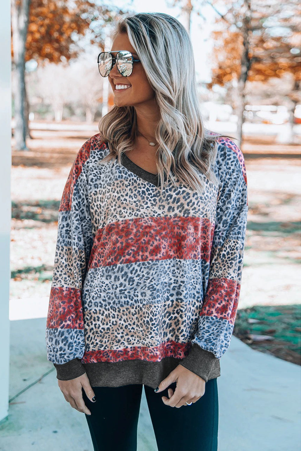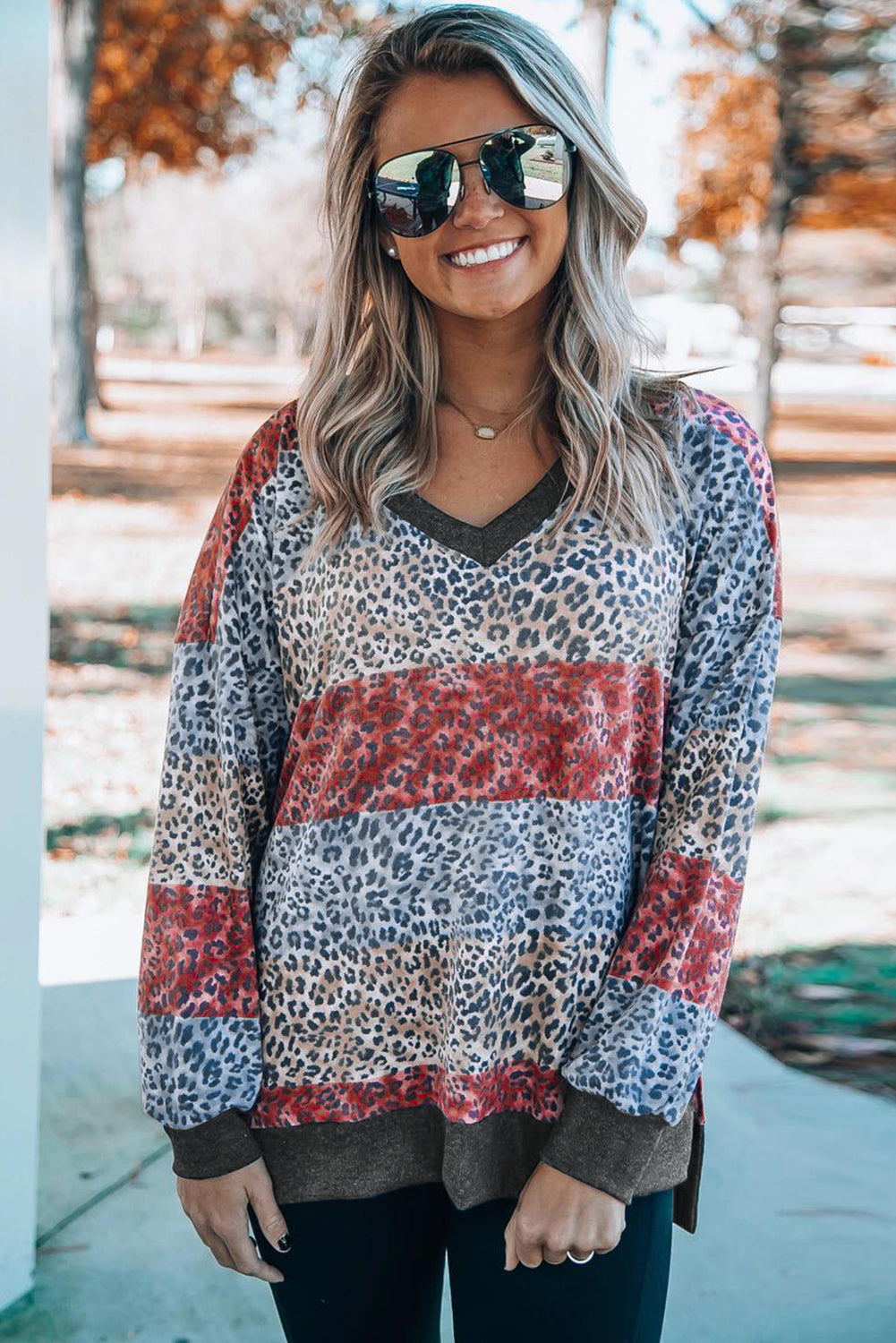 Top de bloque de color de leopardo con cuello en V y manga con hombros caídos