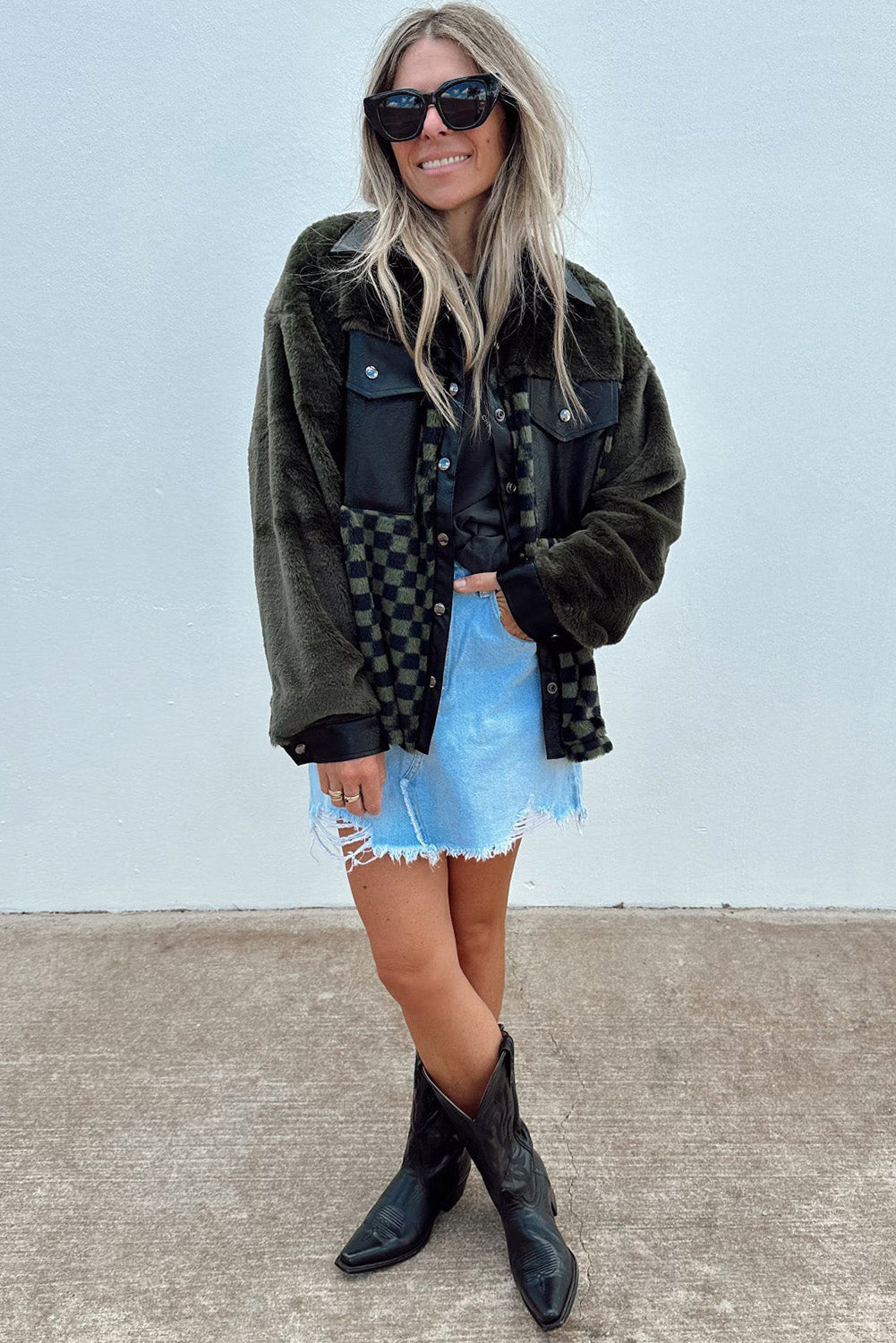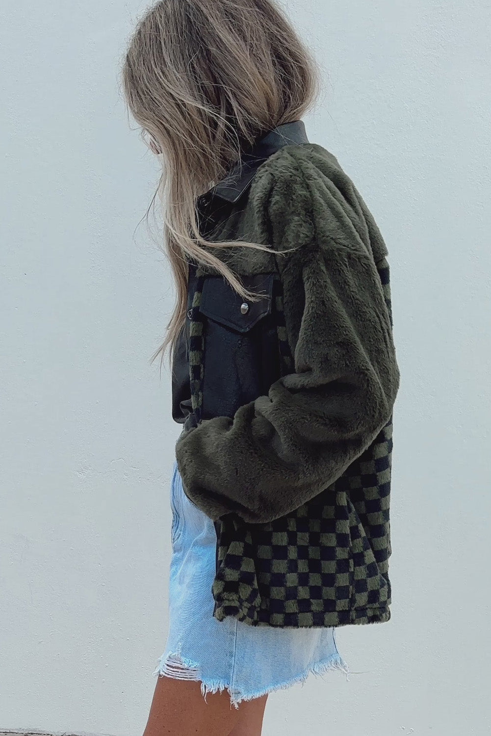 Vineyard Green Fleece Checkerboard Flap Pocket Snap Button Jacket