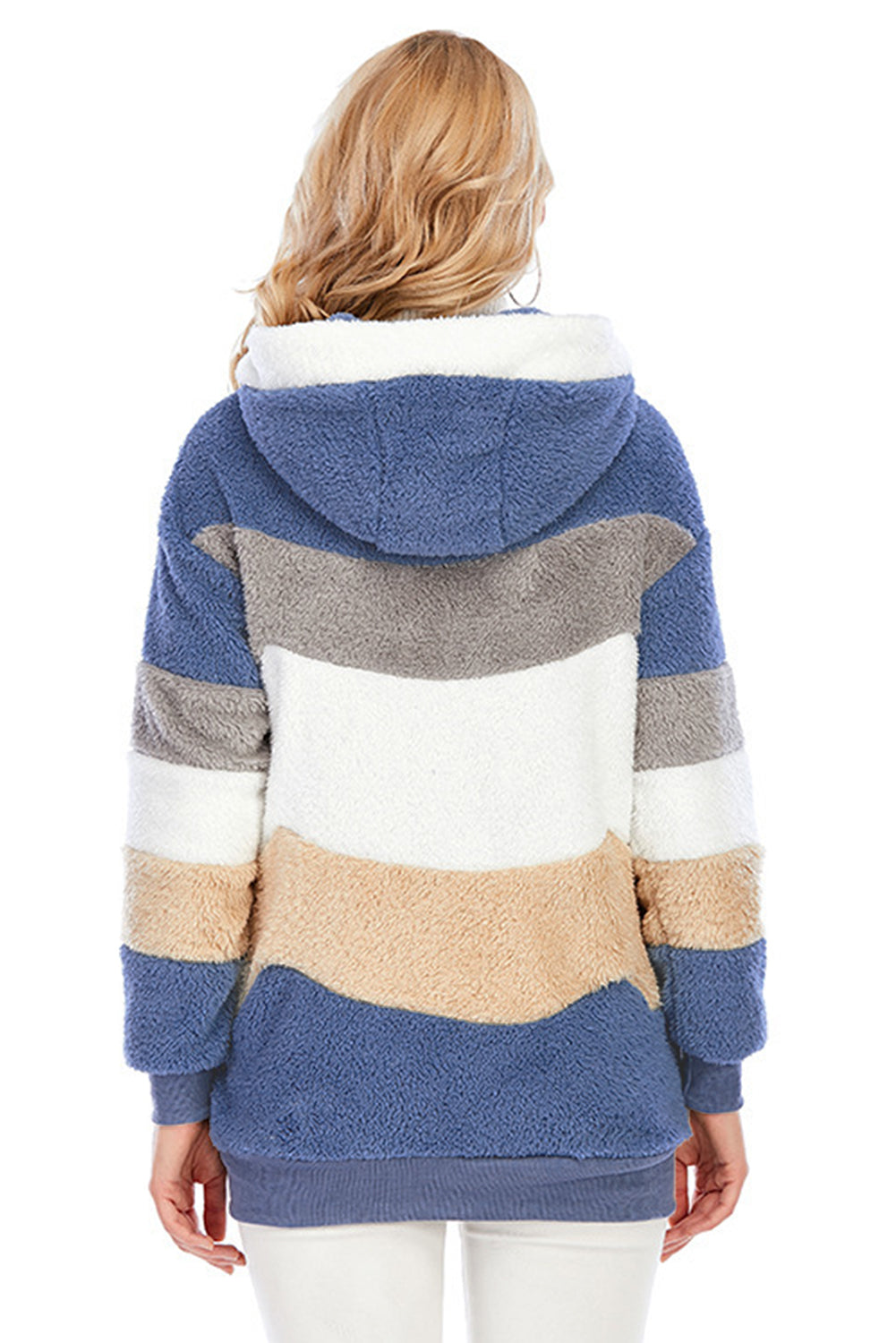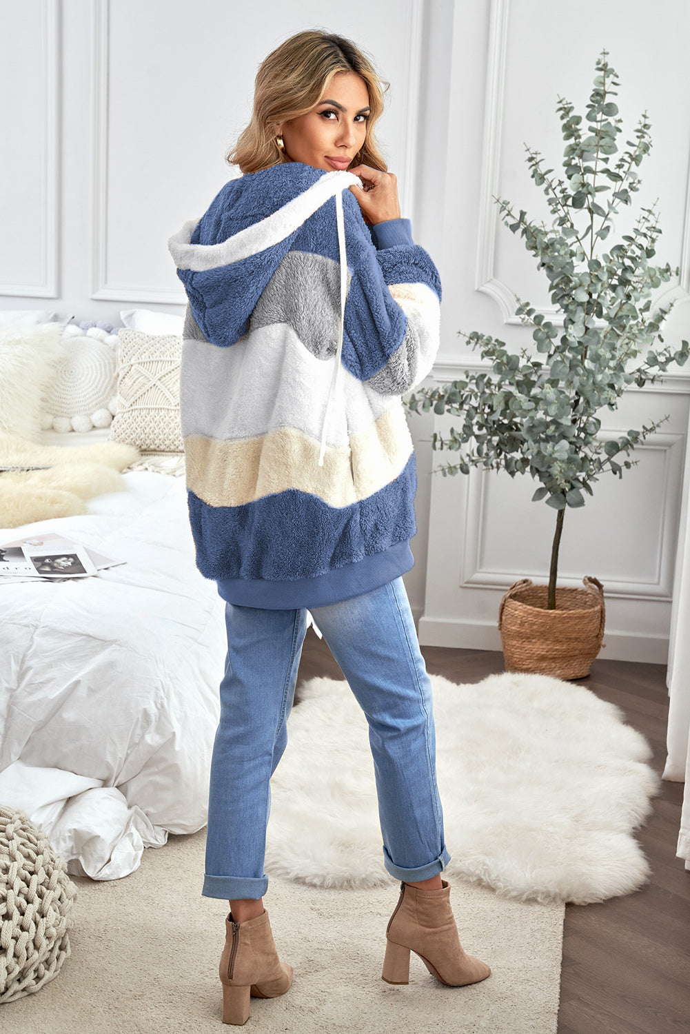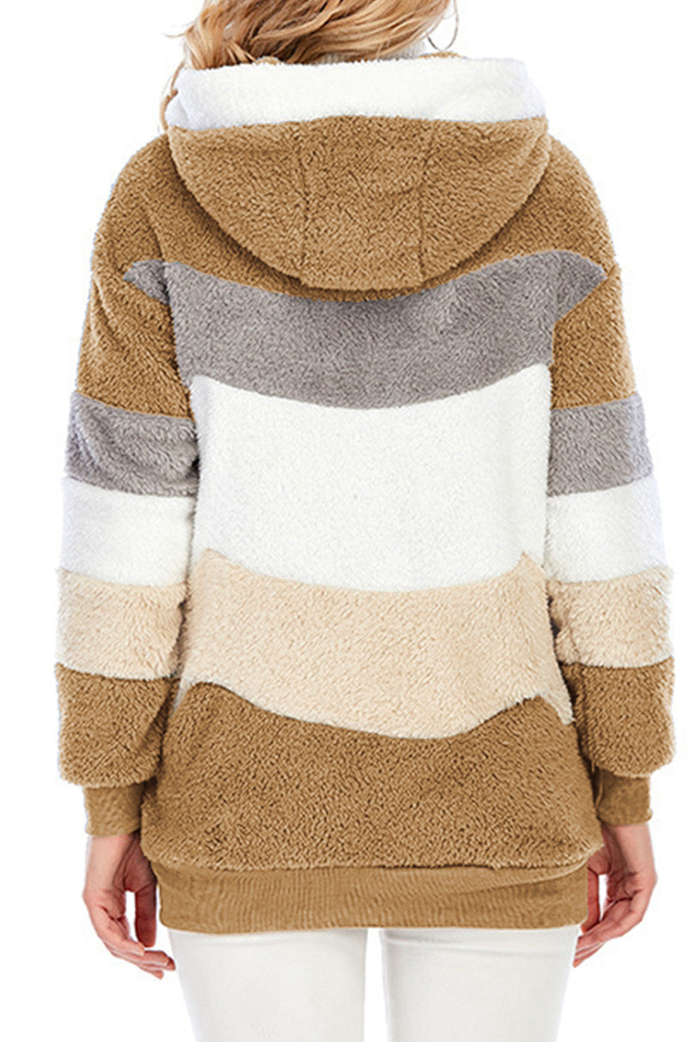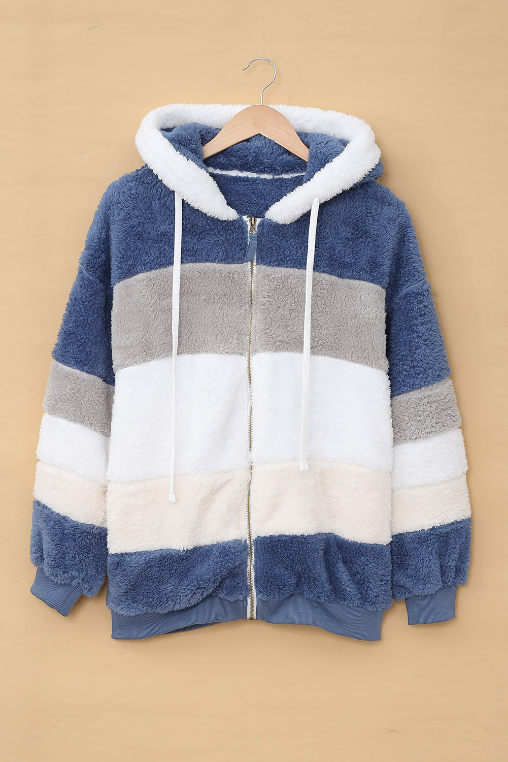 Abrigo sherpa con cremallera y bloques de color rojo vino con capucha
