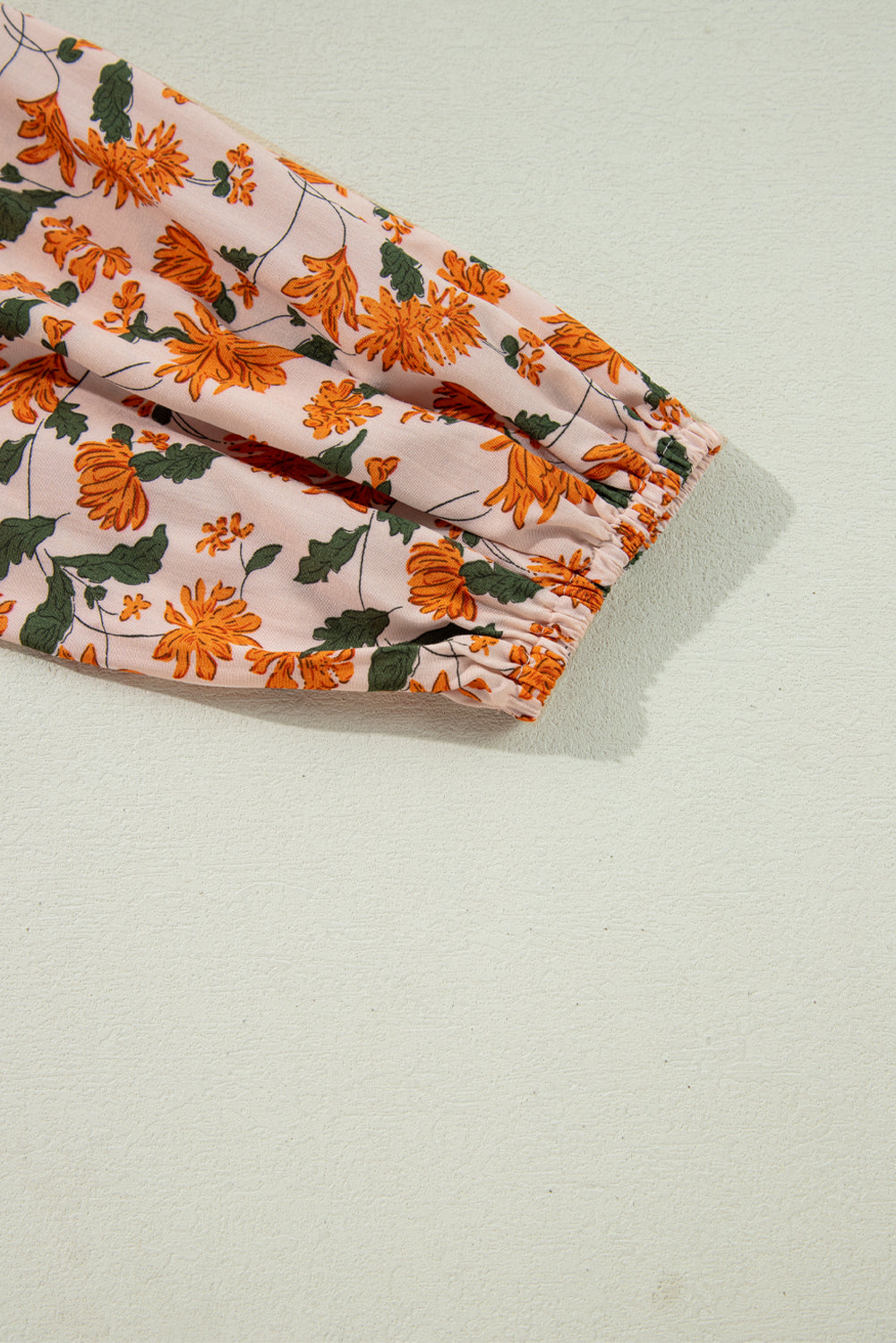 Robe babydoll beige à fleurs, décolleté en V profond, buste froncé, manches bouffantes