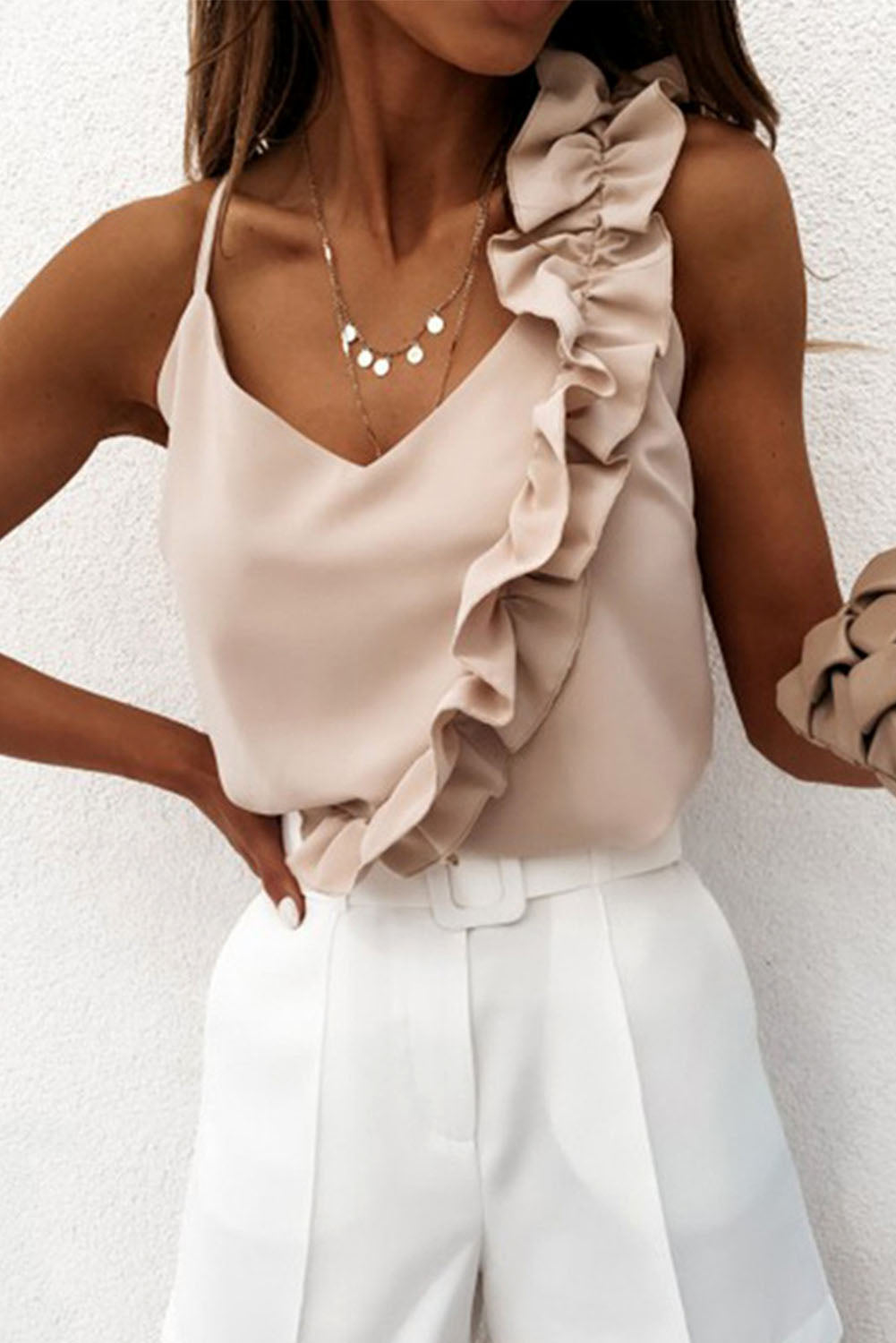 Débardeur beige à volants et col en V avec bretelles spaghetti et patchwork