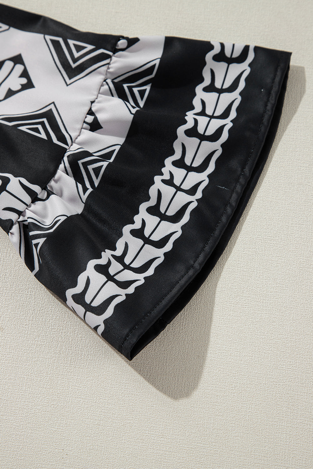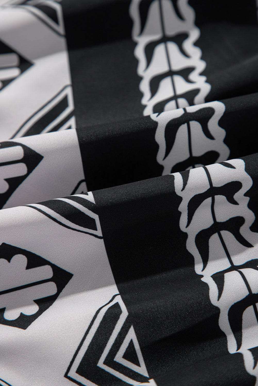Cette élégante robe à col en V arbore un imprimé géométrique noir audacieux et de délicats volants, créant une allure chic et féminine. Le col en V souligne le décolleté, tandis que les volants ajoutent une touche de sophistication. Adoptez un style décontracté avec cette superbe robe.