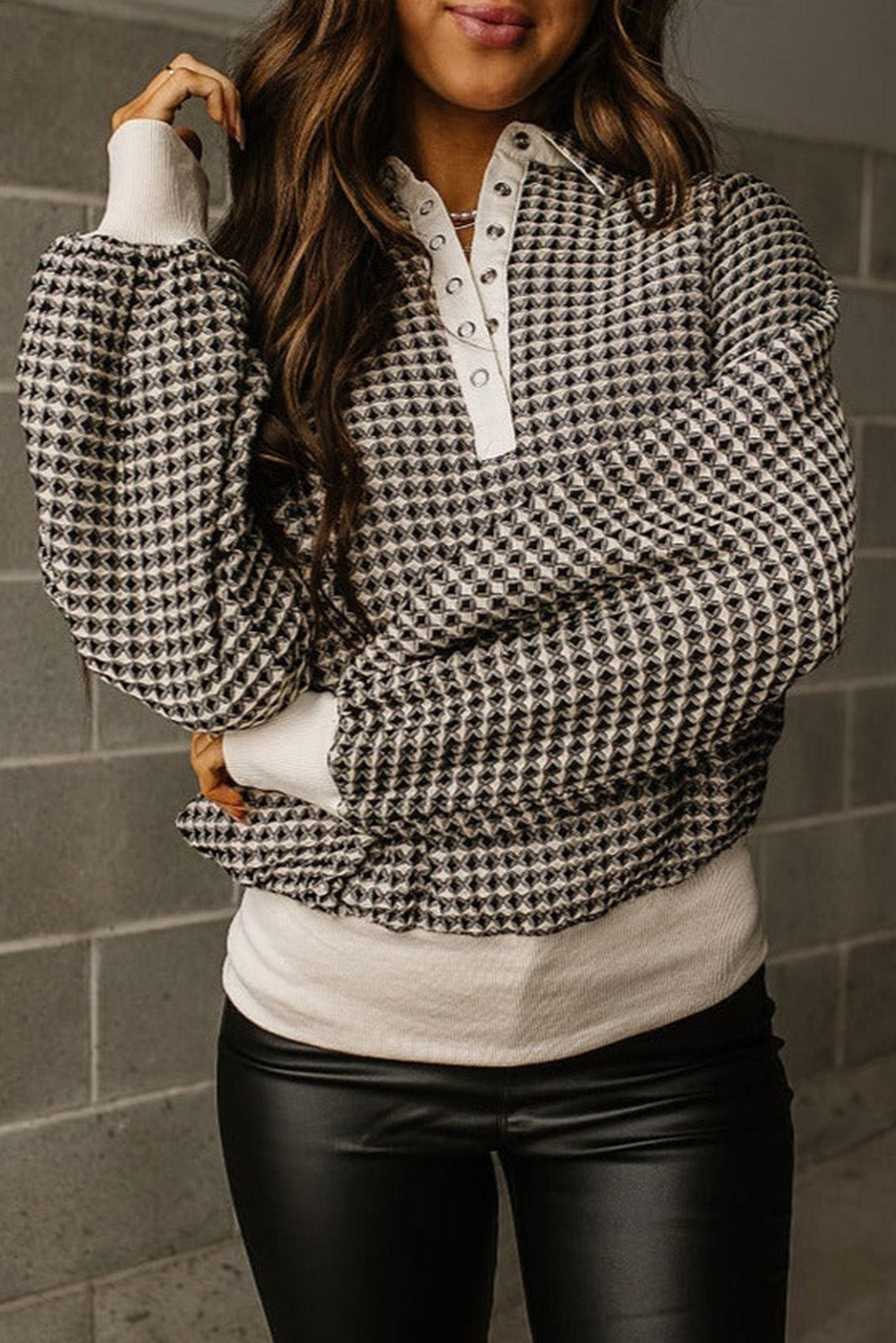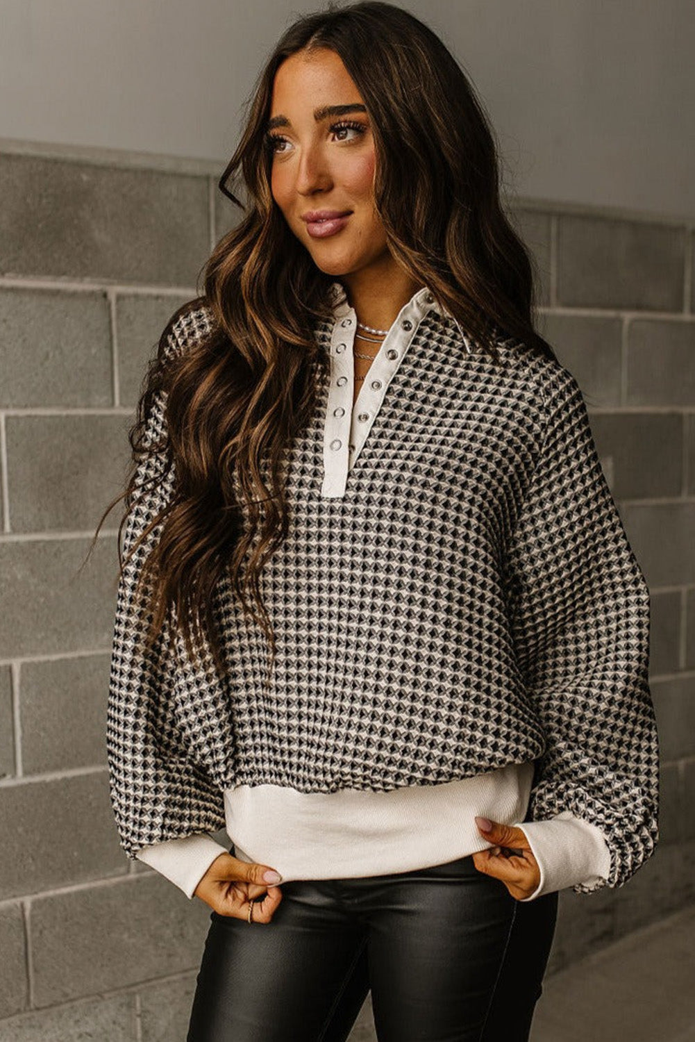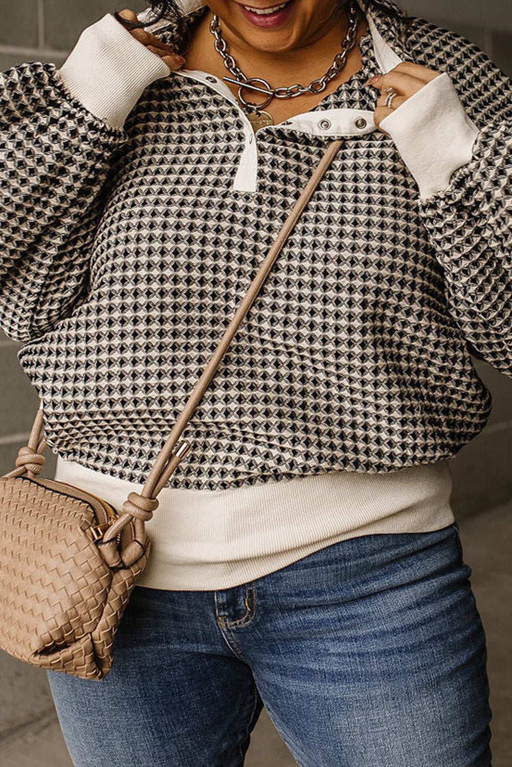 Découvrez le sweat-shirt noir grande taille à col contrasté bicolore. Ce sweat élégant arbore une couleur noire audacieuse avec un design bicolore contrasté et une encolure à col. Confectionné dans un mélange de matières confortable, il est parfait au quotidien. Démarquez-vous avec style grâce à cet indispensable de votre garde-robe.