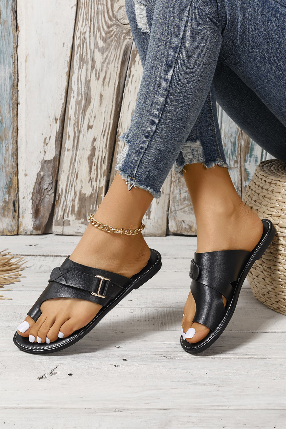 Ces sandales plates noires à anneau d'orteil allient style et confort dans un design élégant. L'anneau d'orteil ajoute une touche d'élégance, tandis que la semelle plate assure une tenue tout au long de la journée. Fabriquées avec des matériaux durables, ces pantoufles sont parfaites en toute occasion. Sublimez vos chaussures d'été avec ces sandales polyvalentes.