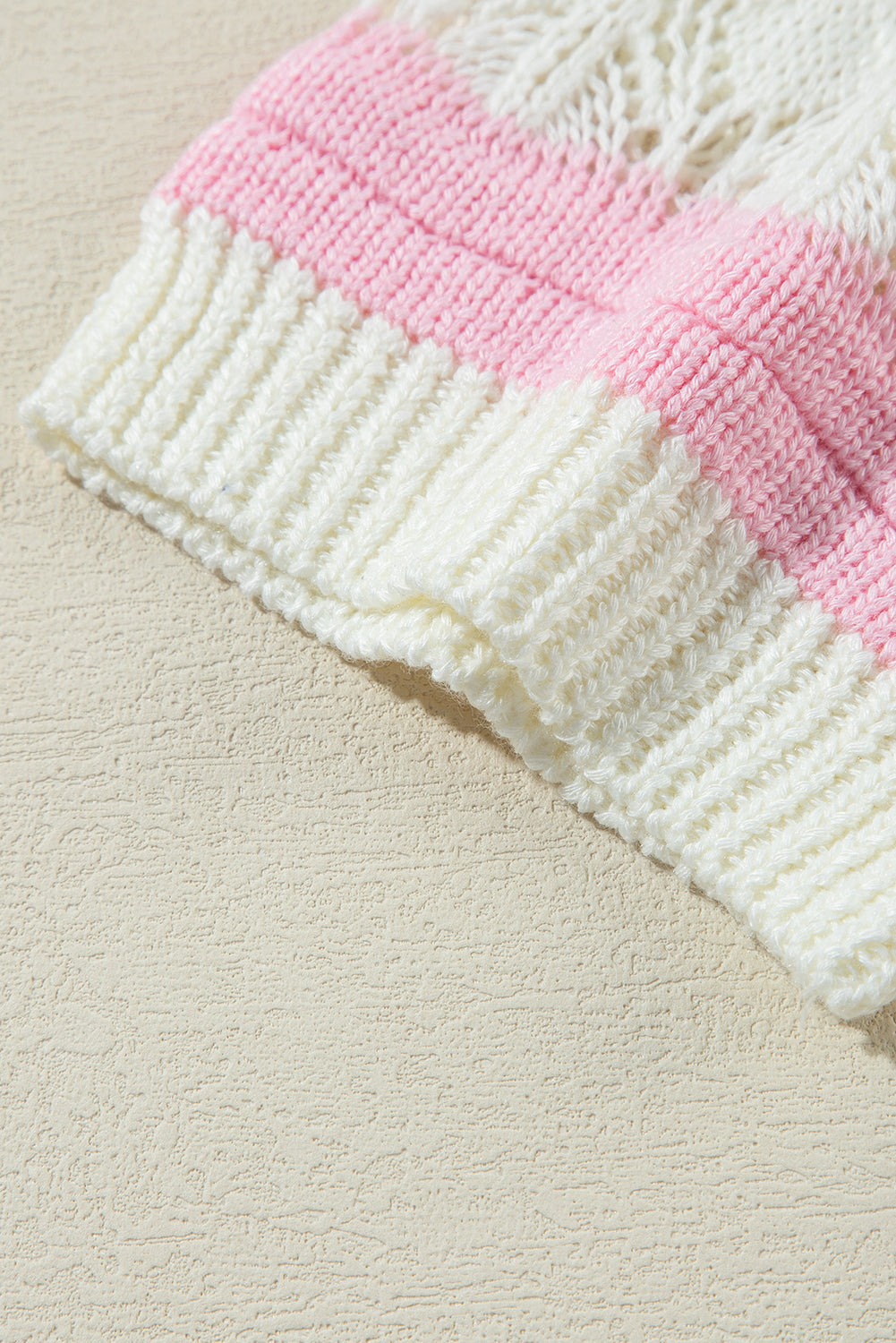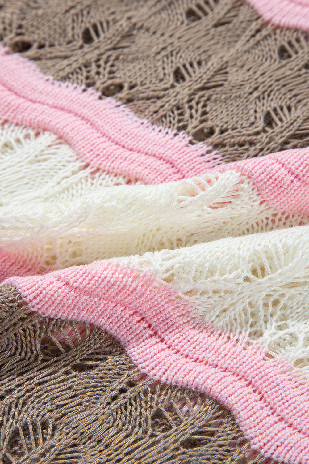 Pull à manches mi-longues en crochet ajouré à rayures marron et blocs de couleurs