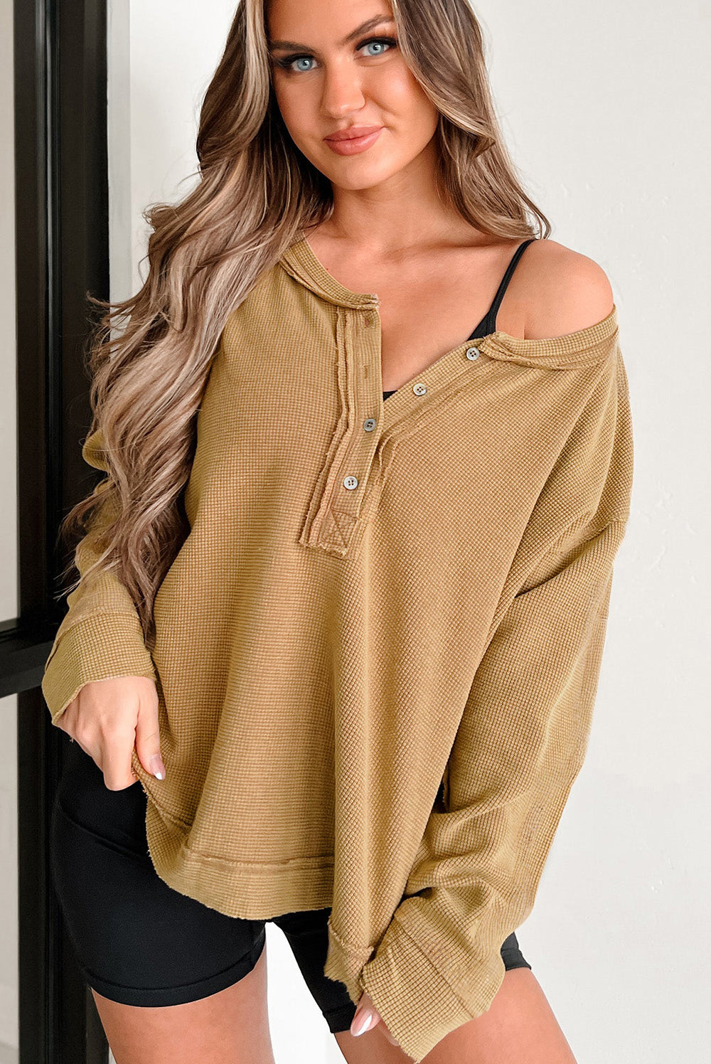 Haut oversize en tricot texturé camel à demi-boutons et épaules tombantes