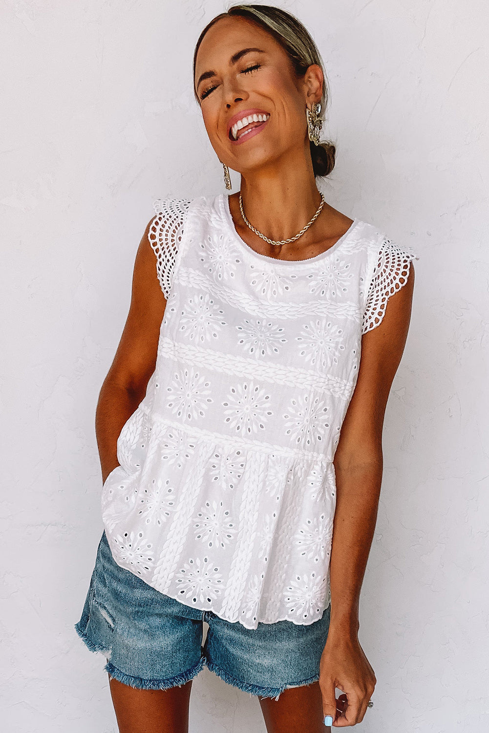 Chemisier à manches volantées et découpes en dentelle contrastante