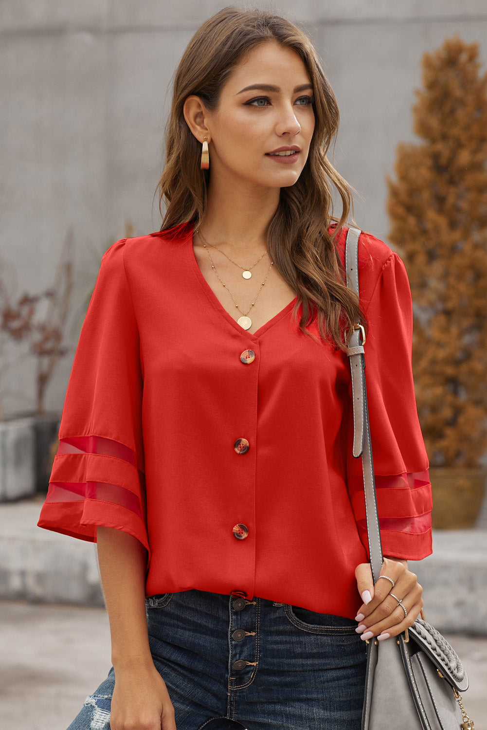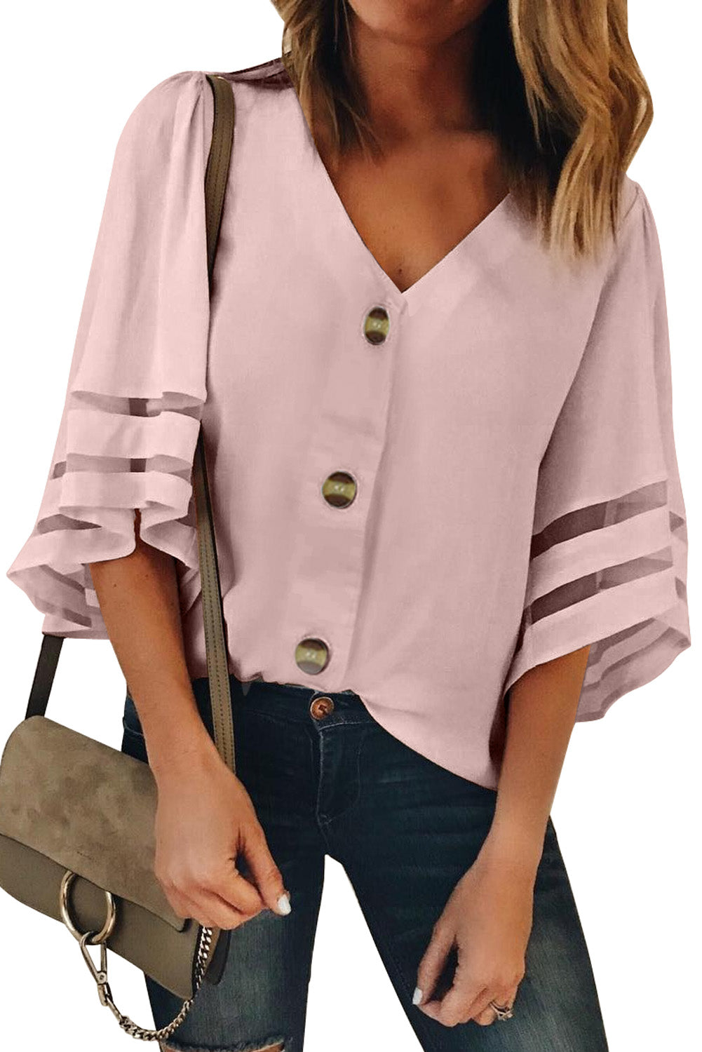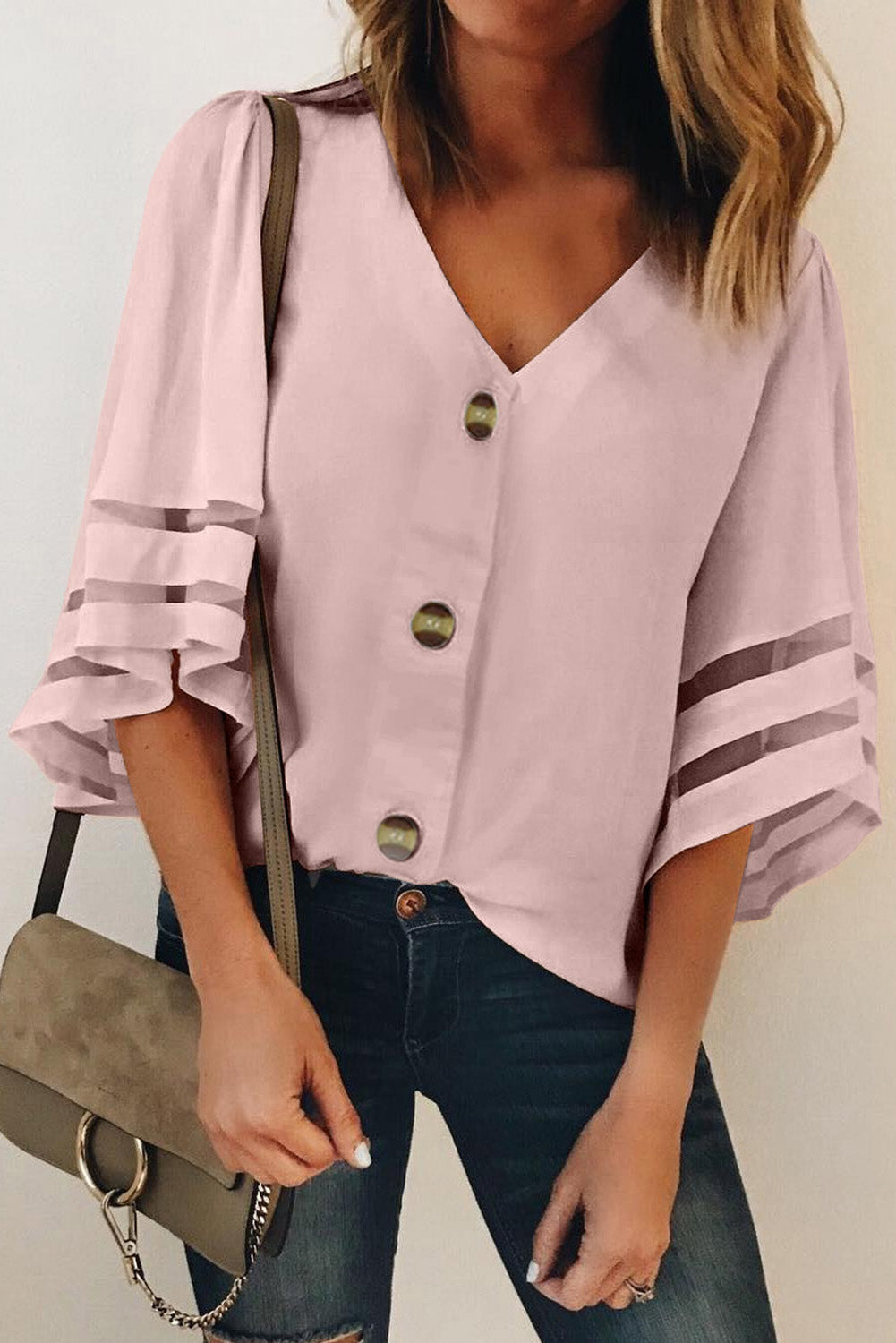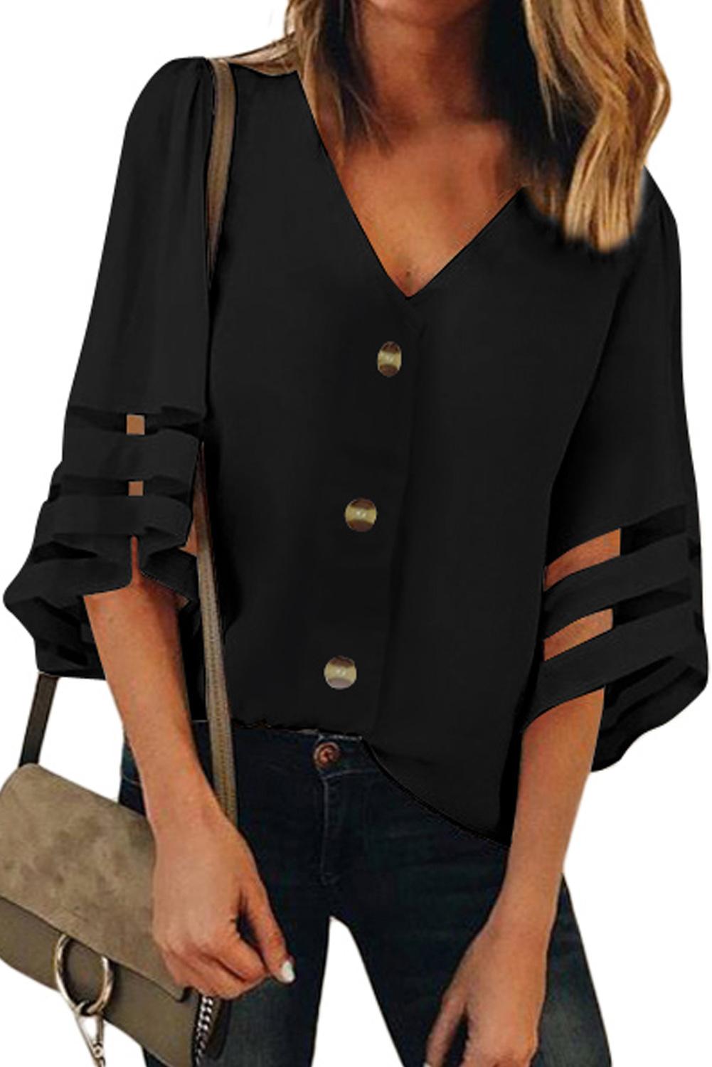 Chemisier boutonné à manches évasées et col en V
