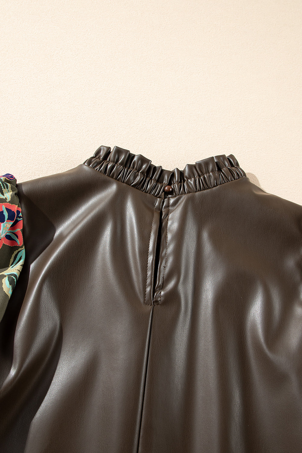 Chemisier à col rond et volants en similicuir à motif floral trèfle à quatre feuilles, manches bouffantes et patchwork